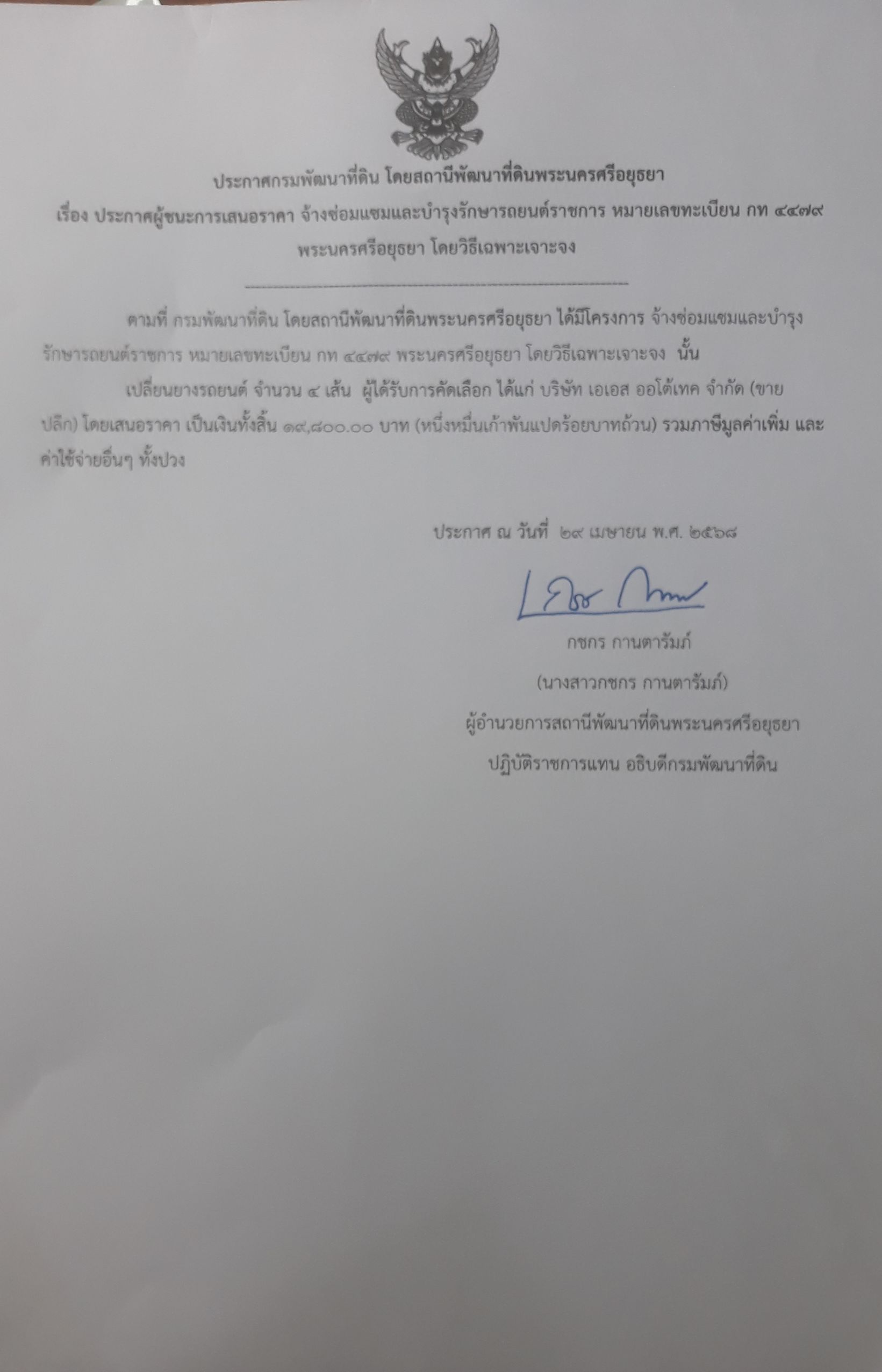 -ประกาศกรมพัฒนาที่ดิน โดยสถานีพัฒนาที่พระนครศรีอยุธยา เรื่อง ประกาศผู้ชนะการเสนอราคา จ้างซ่อมแซ่มและบำรุงรถยนต์ราชการ หมายเลขทะเบียน กท 4479 พระนครศรีอยุธยา โดยวิธีเฉพาะเจาะจง