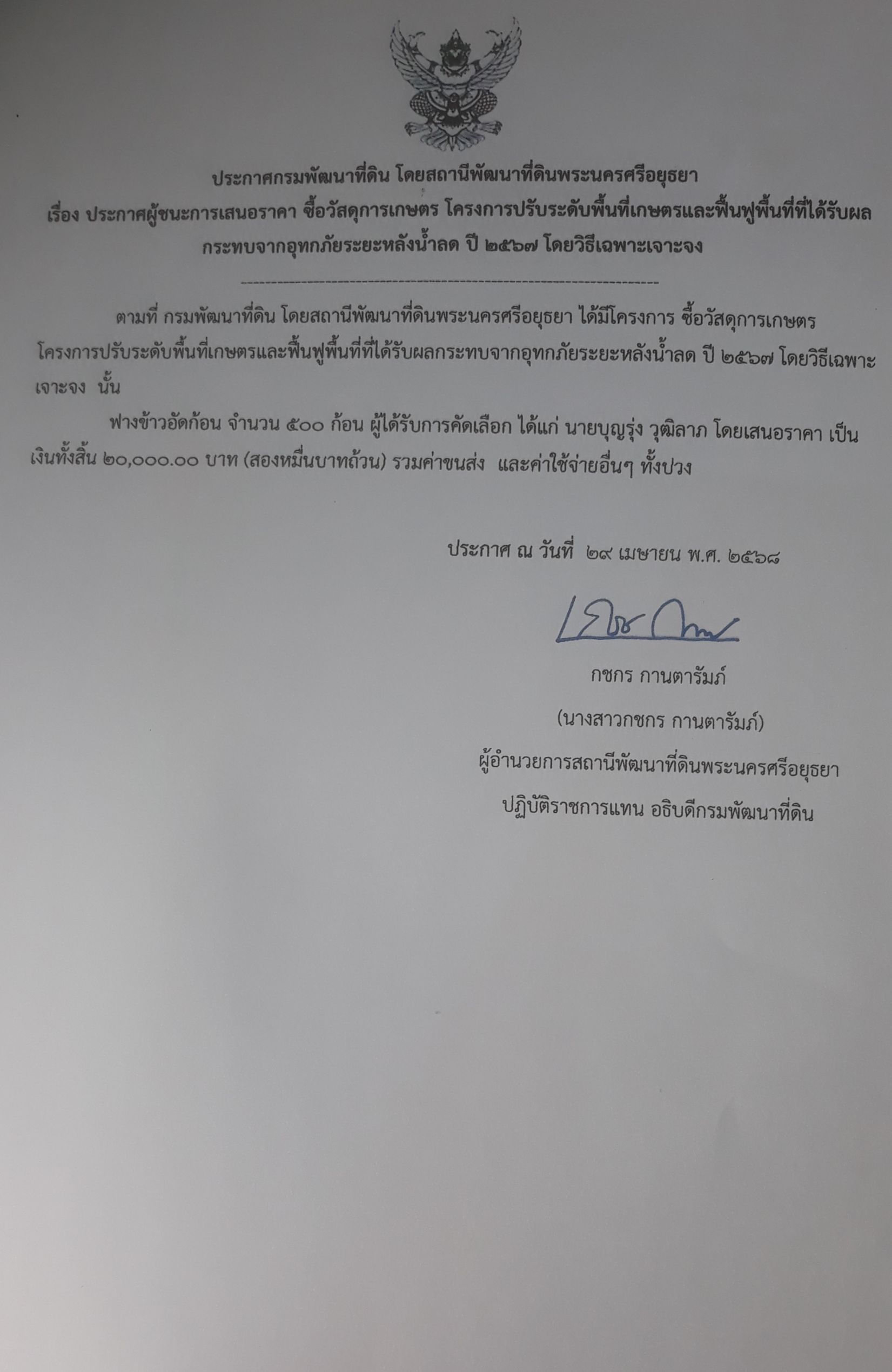 -ประกาศกรมพัฒนาที่ดิน โดยสถานีพัฒนาที่ดินพระนครศรีอยุธยา เรื่อง ประกาศผู้ชนะการเสนอราคา ซื้อวัสดุการเกษตรเพื่อดำเนินงานโครงการฟื้นฟูที่ที่ได้รับผลกระทบจากอุทกภัยระยะเฉพาะหน้าในพื้นที่เฉพาะทุ่งรังสิต ทุ่งมหาราช ปีงบประมาณ 2568 โดยวิธีเฉพาะเจาะจง