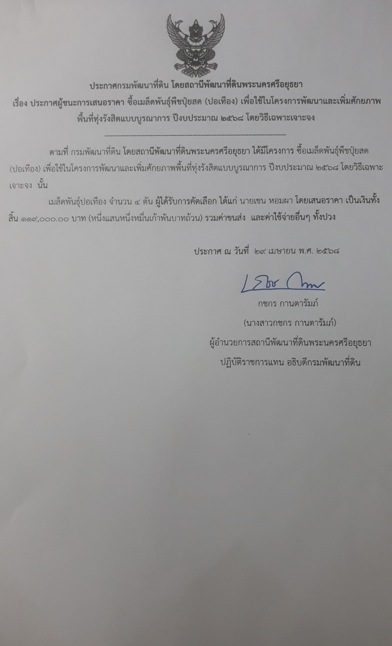 -ประกาศกรมพัฒนาที่ดิน โดยสถานีพัฒนาที่พระนครศรีอยุธยา เรื่อง ประกาศผู้ชนะการเสนอราคา ซื้อพืชปุ๋ยสด (ปอเทือง) ปรับปรุงบำรุงดินเพื่อใช้ในโครงการพัฒนาพื้นที่เฉพาะ ปีงบประมาณ 2568 โดยวิธีเฉพาะเจาะจง