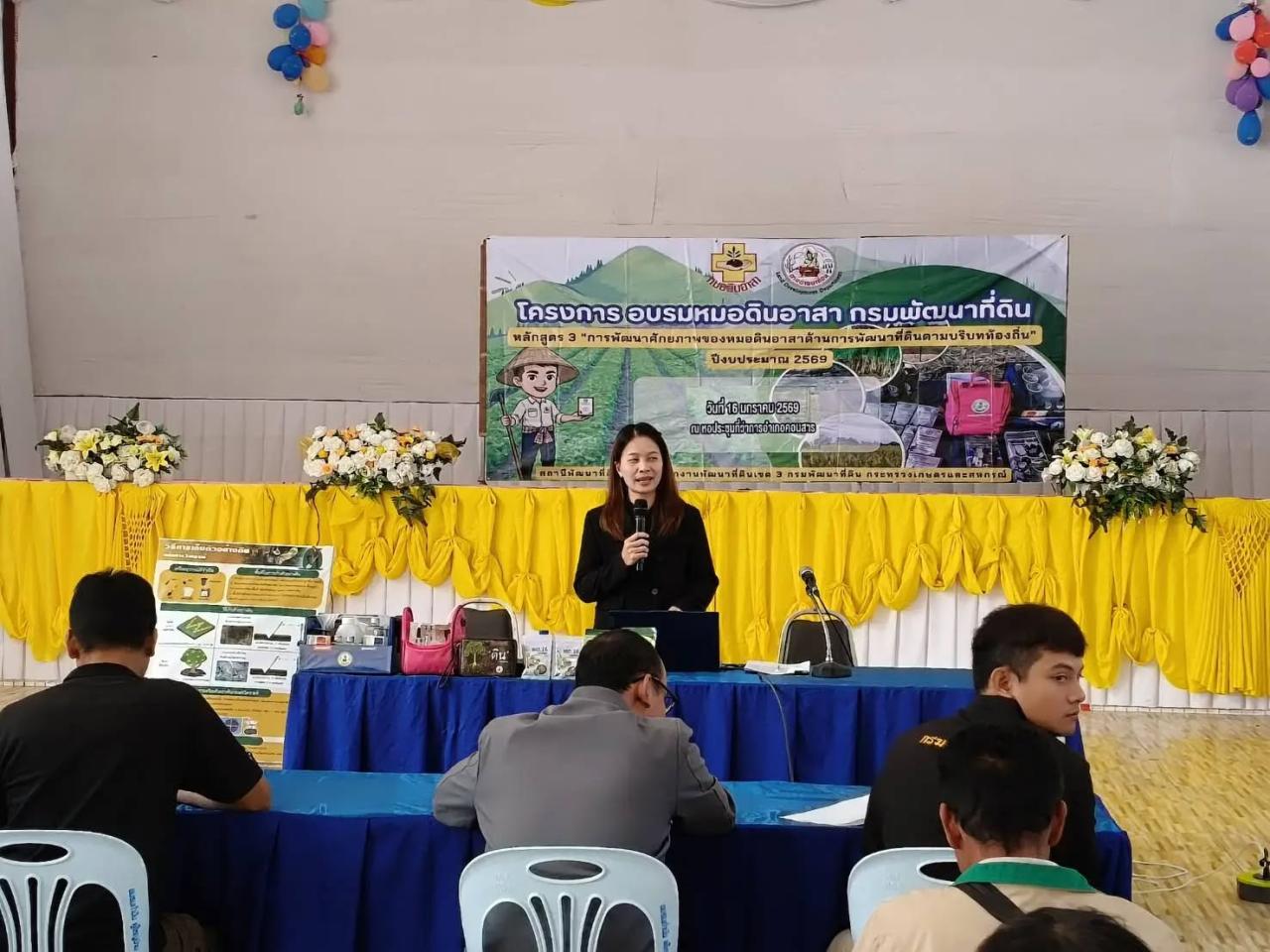 นายไลซันต์ ตั้งภูมิ ผู้อำนวยการสถานีพัฒนาที่ดินชัยภูมิ มอบหมายให้ นางสาวขวัญสุดา ขันบุตร นักวิชาการเกษตรปฏิบัติการ พร้อมด้วย นายวิบูลย์ ภักดีโชติ นักวิชาการเกษตร จัดโครงการอบรมหมอดินอาสา หลักสูตร 3 การพัฒนาศักยภาพของหมอดินอาสา ด้านการพัฒนาที่ดินตามบริบทท้องถิ่น ปีงบประมาณ 2569 ณ หอประชุมอำเภอคอนสาร จังหวัดชัยภูมิ วัตถุประสงค์ เพื่อพัฒนาศักยภาพหมอดินอาสา ให้ได้เรียนรู้เทคโนโลยีด้านการพัฒนาที่ดินที่เหมาะสมกับสภาพพื้นที่และมีส่วนร่วมในการแสดงความคิดเห็นแลกเปลี่ยนเรียนรู้ ส่งเสริมและพัฒนาความเข้มแข็งให้กับเครือข่ายหมอดินอาสาให้สามารถเข้าถึงข้อมูลและใช้เทคโนโลยีสารสนเทศได้ สามารถถ่ายทอดองค์ความรู้ด้านการพัฒนาที่ดินให้กับเกษตรกร ประชาชน ที่มีความสนใจ สามารถนำไปประยุกต์ใช้ได้อย่างเหมาะสม และก่อให้เกิดเครือข่ายด้านการพัฒนาที่ดินอย่างยั่งยืน มีหมอดินอาสาเข้าร่วมอบรมจำนวน 48 ราย