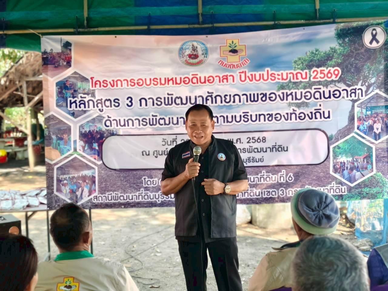 วันพฤหัสบดีที่ 18 ธันวาคม 2568 สถานีพัฒนาที่ดินบุรีรัมย์ โดย นายอณน เกิดเอกี นักวิชาการเกษตร จัดฝึกอบรมโครงการอบรมหมอดินอาสา หลักสูตร 3 การพัฒนาศักยภาพของหมอดินอาสา ด้านการพัฒนาที่ดินตามบริบทท้องถิ่น ปีงบประมาณ 2569 โดยได้รับเกียรติจาก นายวิญญู เสมียนรัมย์ ผู้อำนวยการสถานีพัฒนาที่ดินบุรีรัมย์ เป็นประธานเปิดการจัดฝึกอบรมโครงการอบรมหมอดินอาสาหลักสูตร 3 ณ ศูนย์ถ่ายทอดเทคโนโลยีการพัฒนาที่ดินตำบลตะโกตาพิ ต.ตะโกตาพิ อ.ประโคนชัย จ.บุรีรัมย์ วัตถุประสงค์เพื่อพัฒนาศักยภาพหมอดินอาสาให้ได้เรียนรู้เทคโนโลยีด้านการพัฒนาที่ดินที่เหมาะสมกับสภาพพื้นที่และมีส่วนร่วมในการแสดงความคิดเห็นแลกเปลี่ยนเรียนรู้ ส่งเสริมและพัฒนาความเข้มแข็งให้กับเครือข่ายหมอดินอาสาให้สามารถเข้าถึงข้อมูลและใช้เทคโนโลยีสารสนเทศได้ สามารถถ่ายทอดองค์ความรู้ด้านการพัฒนาที่ดินให้กับเกษตรกร ประชาชนที่มีความสนใจ สามารถนำไปประยุกต์ใช้ได้อย่างเหมาะสม และก่อให้เกิดเครือข่ายด้านการพัฒนาที่ดินอย่างยั่งยืน และขยายผลสู่เกษตรกรทั่วไป