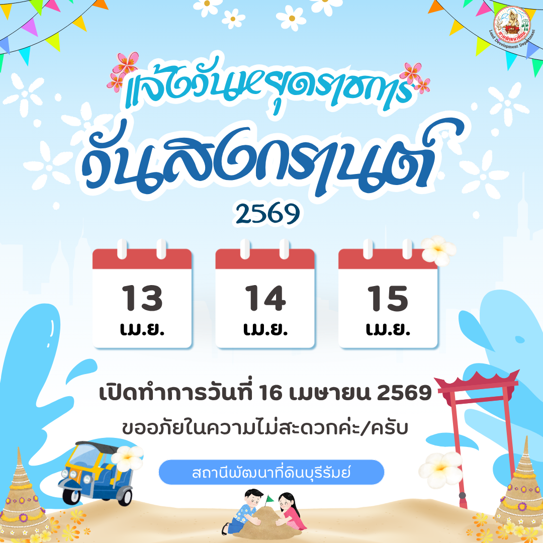 สถานีพัฒนาที่ดินบุรีรัมย์ ขอแจ้งวันหยุดราชการ วันที่ 13-15 เมษายน 2569 เนื่องในวันหยุดเทศกาลสงกรานต์ ประจำปี 2569