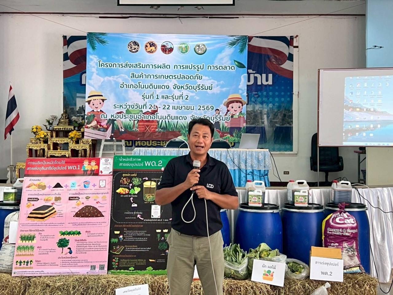 วันอังคารที่ 21 เมษายน 2569 สถานีพัฒนาที่ดินบุรีรัมย์ โดย นายรัฐสยาม อรุณศรี พนักงานขับรถยนต์ ส 2 เข้าร่วมโครงการส่งเสริมการผลิต การแปรรูป การตลาด สินค้าเกษตรปลอดภัย กิจกรรมหลัก:ส่งเสริมการสร้างความเข้มแข็งในกลุ่มเกษตรกร ตามหลักปรัชญาเศรษฐกิจพอเพียง กิจกรรมย่อย: อบรมถ่ายทอดความรู้ การผลิตปุ๋ยอินทรีย์ เพื่อทดแทนการใช้ปุ๋ยเคมี ณ หอประชุมอำเภอโนนดินแดง จังหวัดบุรีรัมย์ โดยมี นายศิริมงคลรัตน์ วงศ์วรรณา นายอำเภอโนนดินแดง เป็นประธานเปิดโครงการฯ พร้อมหน่วยงานในสังกัดกระทรวงเกษตรฯ ผู้นำท้องถิ่น และเกษตรกร การจัดกิจกรรมครั้งนี้เป็นการขับเคลื่อนโครงการส่งเสริมสินค้าเกษตรปลอดภัยเพื่อส่งเสริมให้เกษตรกร ลดต้นทุนการผลิตภาคการเกษตรหันมาใช้ปุ๋ยอินทรีย์ที่เป็นมิตรต่อสิ่งแวดล้อมและสามารถพึ่งพาตนเองได้อย่างยั่งยืน สอดคล้องกับสถานการณ์ปัจจุบัน ที่ปุ๋ยเคมีมีราคาสูงส่งผลกระทบต่อต้นทุน การผลิตของเกษตรกร