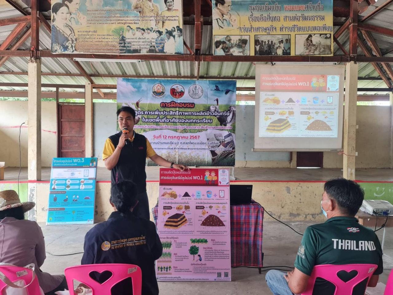 วันศุกร์ที่ 12 กรกฎาคม 2567 สถานีพัฒนาที่ดินบุรีรัมย์ โดย นายสืบศักดิ์ แก้ววิชิต นักวิชาการเกษตร ร่วมเป็นวิทยาอบรมบรรยายให้ความรู้พร้อมสาธิตการผลิตปุ๋ยหมักจากสารเร่ง ซุปเปอร์ พด.1, น้ำหมักชีวภาพ จากสารเร่งซุปเปอร์ พด.2 และสารป้องกันโรคพืช จากสารเร่งซุปเปอร์ พด.3 ให้กับเกษตรกรกลุ่มเป้าหมาย ใน โครงการส่งเสริมการผลิต การแปรรูป การตลาดสินค้าเกษตรปลอดภัย หลักสูตร "การเพิ่มประสิทธิภาพการผลิตข้าวอินทรีย์ในเขตพื้นที่อาศัยของนกกระเรียน" ณ ศาลาประชาคมบ้านหนองไผ่ หมู่ 3 ตำบลสะแกโพรง อำเภอเมือง จังหวัดบุรีรัมย์ วัตถุประสงค์เพื่อถ่ายทอดความรู้ในด้านการปรับปรุงบำรุงดินให้กับเกษตรกร ลดต้นทุนในด้านการผลิต ใช้สารอินทรีย์ทดแทน สามารถผลิตข้าวได้อย่างมีประสิทธิภาพและมีประสิทธิผล