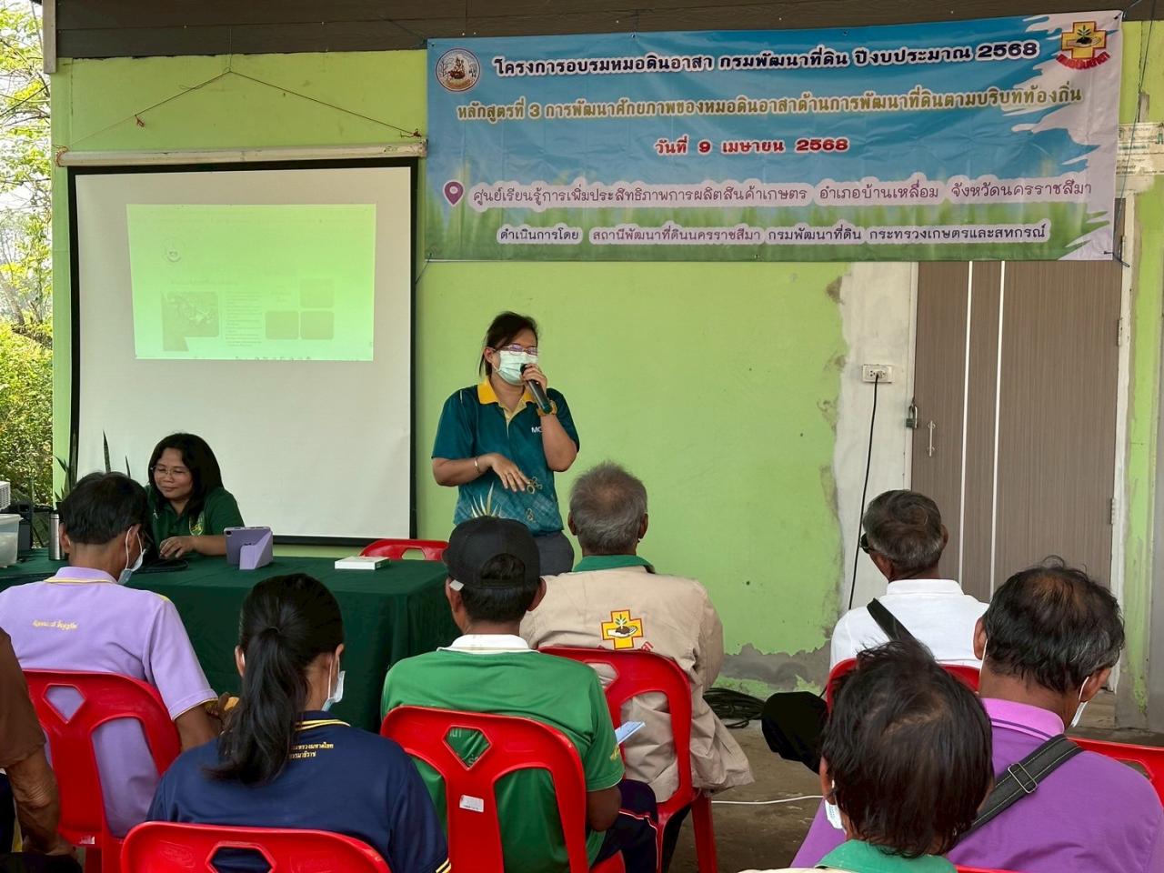 วันที่ 9 เมษายน พ.ศ. 2568 เวลา 09.30 น. นายวิญญู เสมียนรัมย์ ผู้อำนวยการสถานีพัฒนาที่ดินนครราชสีมา มอบหมายให้ นางสาวสุกัญญา หันน้ำเที่ยง นักวิชาการเกษตรชำนาญการพิเศษ พร้อมด้วย ว่าที่ ร.ต.หญิง ศิริรัตน์ ภูมิเขตต์ นักวิชาการเกษตร ดำเนินการจัดโครงการอบรมหมอดินอาสา กรมพัฒนาที่ดิน ปีงบประมาณ 2568 หลักสูตรที่ 3 การพัฒนาศักยภาพของหมอดินอาสาด้านการพัฒนาที่ดินตามบริบทท้องถิ่น ณ ศูนย์เรียนรู้การเพิ่มประสิทธิภาพการผลิตสินค้าเกษตร อำเภอบ้านเหลื่อม บ้านม่วง หมู่ 2 ตำบลช่อระกา อำเภอบ้านเหลื่อม จังหวัดนครราชสีมา โดยมี ดร.แก้วใจ อ้อชัยภูมิ นักวิชาการเกษตรชำนาญการพิเศษ กลุ่มวิชาการเพื่อการพัฒนาที่ดิน สำนักงานพัฒนาที่ดินเขต 3 ร่วมเป็นวิทยากรให้ความรู้ด้านการพัฒนาที่ดิน หัวข้อ การจัดการดินดาน วัตถุประสงค์เพื่อให้หมอดินอาสาได้เรียนรู้เทคโนโลยีในการพัฒนาที่ดินที่เหมาะสมกับสภาพพื้นที่ โดยหมอดินอาสามีส่วนร่วมในการแสดงความคิดเห็น แลกเปลี่ยนความรู้การแก้ปัญหาด้านดินจากประสบการณ์ในการทำการเกษตรของตนเอง สามารถสร้างเครือข่าย สาขาอาชีพต่าง ๆ หมอดินอาสา และจัดทำต้นแบบหมอดินอาสาในการแก้ไขปัญหาดินต่าง ๆ ได้อย่างมีประสิทธิภาพ
