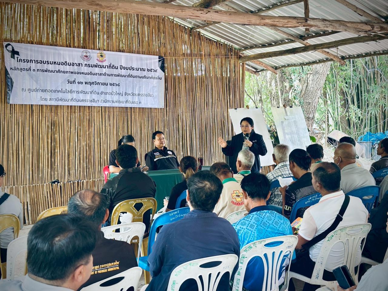 วันที่ 12 พฤศจิกายน พ.ศ. 2568 เวลา 09.30 น. นายวิญญู เสมียนรัมย์ ผู้อำนวยการสถานีพัฒนาที่ดินนครราชสีมา มอบหมายให้ นางสาวสุกัญญา หันน้ำเที่ยง นักวิชาการเกษตรชำนาญการพิเศษ พร้อมด้วย ว่าที่ ร.ต.หญิง ศิริรัตน์ ภูมิเขตต์ นักวิชาการเกษตร ดำเนินการจัดโครงการอบรมหมอดินอาสา กรมพัฒนาที่ดิน ปีงบประมาณ 2569 หลักสูตรที่ 3 การพัฒนาศักยภาพของหมอดินอาสาด้านการพัฒนาที่ดินตามบริบทของท้องถิ่น โดยมี นายพุทธิพงษ์ เรืองจันทร์ ผู้อำนวยการกลุ่มสำรวจเพื่อทำแผนที่ สำนักงานพัฒนาที่ดินเขต 3 ร่วมเป็นวิทยากรให้ความรู้ ณ ศูนย์เทคโนโลยีการพัฒนาที่ดิน อำเภอบัวใหญ่ จังหวัดนครราชสีมา วัตถุประสงค์เพื่อให้หมอดินอาสาได้เรียนรู้เทคโนโลยีในการพัฒนาที่ดินที่เหมาะสมกับสภาพพื้นที่ พร้อมมีส่วนร่วมในการแสดงความคิดเห็น แลกเปลี่ยนความรู้การแก้ปัญหาด้านดินจากประสบการณ์ในการทำการเกษตรของตนเอง สามารถสร้างเครือข่าย สาขาอาชีพต่าง ๆ หมอดินอาสา และจัดทำต้นแบบหมอดินอาสาในการแก้ไขปัญหาดินต่าง ๆ ได้อย่างมีประสิทธิภาพ