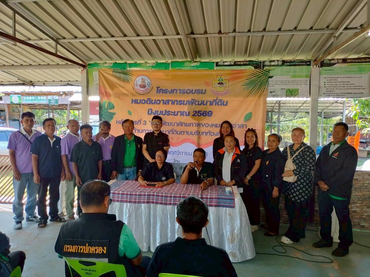 วันที่ 13 พฤศจิกายน พ.ศ. 2568 เวลา 09.30 น. นายวิญญู เสมียนรัมย์ ผู้อำนวยการสถานีพัฒนาที่ดินนครราชสีมา มอบหมายให้ นางสาวสายฝน ซอพิมาย นักวิชาการเกษตรชำนาญการ พร้อมด้วย นางสาวนคณิศร นักปาละโถ นายปวเรศ สุขสว่าง และ นางสาวเพ็ญพร หินนอก นักวิชาการเกษตร ดำเนินการจัดโครงการอบรมหมอดินอาสา กรมพัฒนาที่ดิน ปีงบประมาณ 2569 หลักสูตรที่ 3 การพัฒนาศักยภาพของหมอดินอาสาด้านการพัฒนาที่ดินตามบริบทของท้องถิ่น ณ ศูนย์ฝึกหมอดินดำบลลำคอหงษ์ บ้านโนนลาว ตำบลลำคอหงษ์ อำเภอโนนสูง จังหวัดนครราชสีมา วัตถุประสงค์เพื่อให้หมอดินอาสาได้เรียนรู้เทคโนโลยีในการพัฒนาที่ดินที่เหมาะสมกับสภาพพื้นที่ พร้อมมีส่วนร่วมในการแสดงความคิดเห็น แลกเปลี่ยนความรู้การแก้ปัญหาด้านดินจากประสบการณ์ในการทำการเกษตรของตนเอง สามารถสร้างเครือข่าย สาขาอาชีพต่าง ๆ หมอดินอาสา และจัดทำต้นแบบหมอดินอาสาในการแก้ไขปัญหาดินต่าง ๆ ได้อย่างมีประสิทธิภาพ