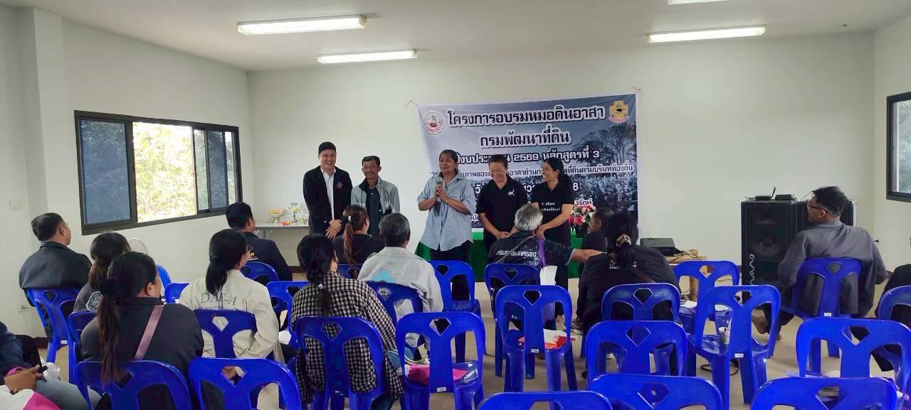 วันที่ 17 ธันวาคม พ.ศ. 2568 เวลา 09.30 น. นางมนัสนันท์ ไชยนุรัตน์ ผู้อำนวยการสถานีพัฒนาที่ดินนครราชสีมา มอบหมายให้ นายอุดม ราสูงเนิน ดร.นพดล การดี และ นางสาวประนัฐญา นีพลกรัง นักวิชาการเกษตร ดำเนินการจัดโครงการอบรมหมอดินอาสา กรมพัฒนาที่ดิน ปีงบประมาณ 2569 หลักสูตรที่ 3 การพัฒนาศักยภาพของหมอดินอาสาด้านการพัฒนาที่ดินตามบริบทของท้องถิ่น ณ ห้องประชุมสำนักงานเกษตรอำเภอเทพารักษ์ จังหวัดนครราชสีมา วัตถุประสงค์เพื่อให้หมอดินอาสาได้เรียนรู้เทคโนโลยีในการพัฒนาที่ดินที่เหมาะสมกับสภาพพื้นที่ พร้อมมีส่วนร่วมในการแสดงความคิดเห็น แลกเปลี่ยนความรู้การแก้ปัญหาด้านดินจากประสบการณ์ในการทำการเกษตรของตนเอง สามารถสร้างเครือข่าย สาขาอาชีพต่าง ๆ หมอดินอาสา และจัดทำต้นแบบหมอดินอาสาในการแก้ไขปัญหาดินต่าง ๆ ได้อย่างมีประสิทธิภาพ