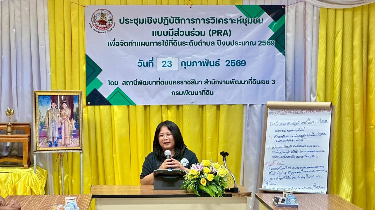 วันที่ 23 กุมภาพันธ์ พ.ศ. 2569 เวลา 09.00 น. นางมนัสนันท์ ไชยนุรัตน์ ผู้อำนวยการสถานีพัฒนาที่ดินนครราชสีมา มอบหมายให้ นางสาวสุกัญญา หันน้ำเที่ยง นักวิชาการเกษตรชำนาญการพิเศษ พร้อมด้วย ว่าที่ ร.ต.หญิง ศิริรัตน์ ภูมิเขตต์ นักวิชาการเกษตร จัดประชุมเชิงปฏิบัติการ การวิเคราะห์ชุมชนแบบมีส่วนร่วม (PRA) เพื่อจัดทำแผนการใช้ที่ดินระดับตำบล ณ สำนักงานเทศบาลตำบลบึงสำโรง อำเภอแก้งสนามนาง จังหวัดนครราชสีมา วัตถุประสงค์เพื่อรักษาเสถียรภาพของทรัพยากรให้เกิดความสมดุลและยั่งยืนภายใต้การพัฒนาด้านต่างๆ ของตำบล มีการใช้ที่ดินมีผลตอบแทนสูงสุดต่อหน่วยเนื้อที่ เกิดการกำหนดแผนงาน โครงการที่สอดคล้องกับแผนการใช้ที่ดินที่กำหนด และอยู่บนหลักการของรูปแบบเศรษฐกิจ BCG