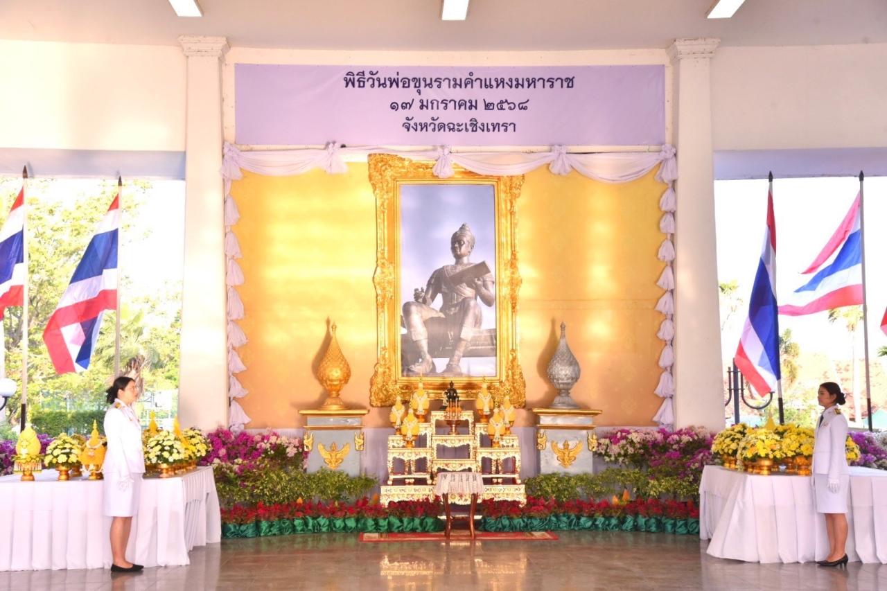 ✅ โดย นายขจรเกียรติ รักพานิชมณีผู้ว่าราชการจังหวัดฉะเชิงเทรา เป็นประธานประกอบพิธีถวายอาศิรวาทราชสดุดี วางพานพุ่มดอกไม้สด จุดธูปเทียน เครื่องทองน้อย และกล่าวน้อมรำลึกถึงพระมหากรุณาธิคุณของพระมหากษัตริยาธิราช ผู้ทรงพระคุณอันยิ่งใหญ่ต่อประเทศ ผู้ทรงประดิษฐ์อักษรไทย ทรงเป็นนักการทหาร นักปกครอง นักการทูต นักปราชญ์ และทรงเป็นนักปกครองที่ยิ่งใหญ่ของปวงชนชาวไทย พร้อมด้วย นางสาวฉัตรประอร นิยม รองผู้ว่าราชการจังหวัดฉะเชิงเทรา หน่วยงานกระทรวงเกษตรจังหวัดฉะเชิงเทรา ข้าราชการ ทหาร ตำรวจ คณะกรรมการ และสมาชิกเหล่ากาชาดจังหวัดฉะเชิงเทรา เข้าร่วมประกอบพิธี