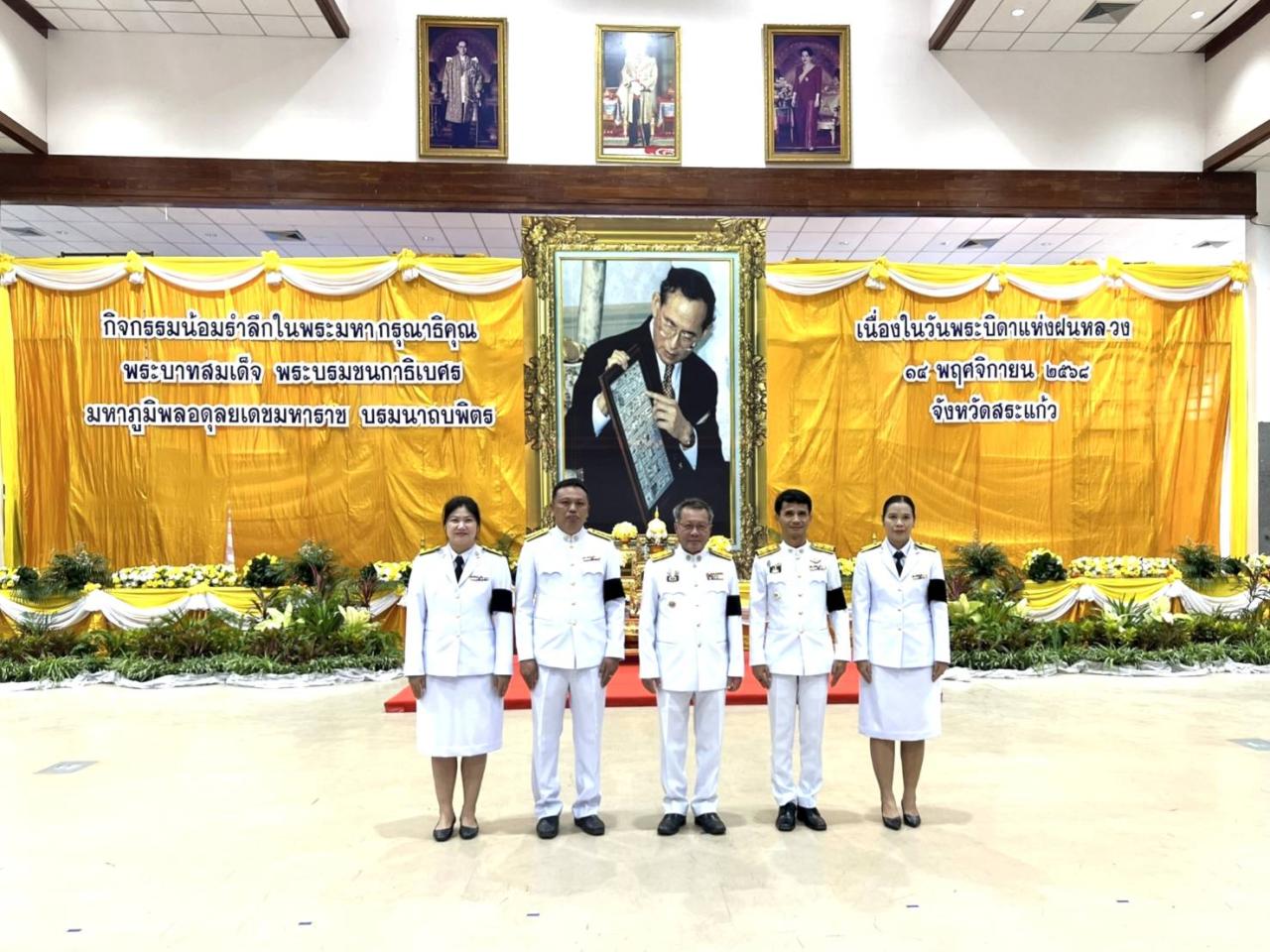 วันที่ 14 พฤศจิกายน 2568 นายขจรยศ สมสาย ผู้อำนวยการสถานีพัฒนาที่ดินสระแก้ว พร้อมเจ้าหน้าที่ เข้าร่วมพิธีวางพานพุ่มดอกไม้สดเนื่องในวันพระบิดา แห่งฝนหลวง ประจำปี 2568 เพื่อจารึกไว้ในประวัติศาสตร์ของชาติไทยให้ประชาชนและอนุชนรุ่นหลังได้มีโอกาสแสดงความจงรักภักดี และน้อมรำลึกในพระมหากรุณาธิคุณของพระบาทสมเด็จพระบรมชนกาธิเบศร มหาภูมิพลอดุลยเดชมหาราช บรมนาถบพิตร "พระบิดาแห่งฝนหลวง" โดยมีนายเชาวเนตร ยิ้มประเสริฐ รองผู้ว่าราชการจังหวัดสระแก้ว เป็นประธานในพิธี ณ หอประชุมปางสีดา ศาลากลางจังหวัดสระแก้ว