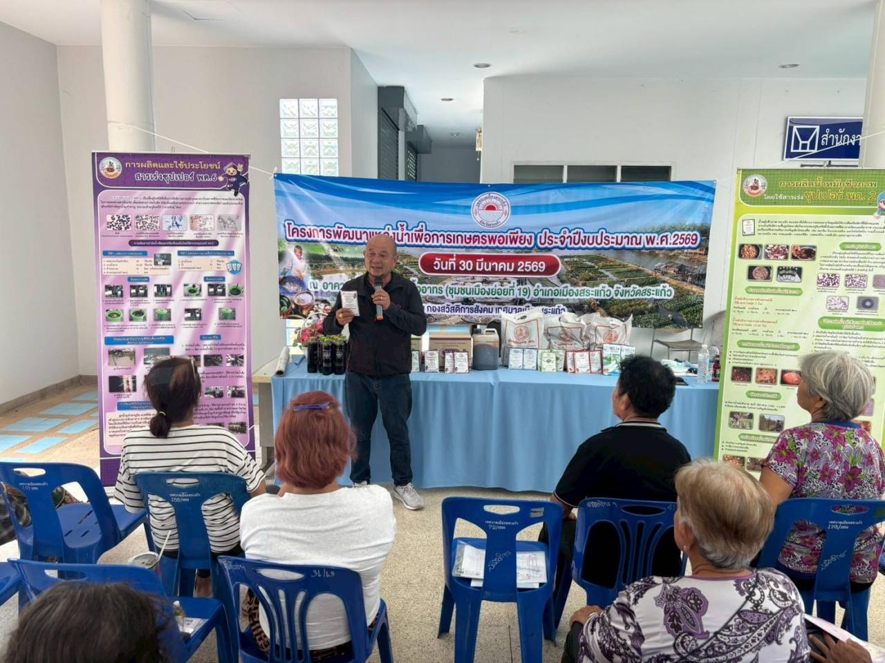 วันจันทร์ที่ 30 มีนาคม 2569 นายขจรยศ สมสาย ผู้อำนวยการสถานีพัฒนาที่ดินสระแก้ว มอบหมายให้นายประภาส ชัยศรี นักวิชาการเกษตร ร่วมเป็นวิทยากรอบรมโครงการพัฒนาแหล่งน้ำเพื่อการเกษตรพอเพียง ประจำปีงบประมาณ 2569 เพื่อส่งเสริมและสนับสนุนให้ประชาชนในชุมชนมีองค์ความรู้ตามหลักปรัชญาเศรษฐกิจพอเพียงส่งเสริมให้เกษตรกรมีส่วนร่วมในการดูแลรักษาแหล่งน้ำ มีน้ำใช้พอเพียงในการทำการเกษตรพัฒนาปรับปรุงสภาพแวดล้อมบริเวณแหล่งน้ำ โดยการใช้ นวัตกรรม พด. การบำบัดน้ำเสียจาก พด.6 ด้วยการใช้ประโยชน์จากแหล่งน้ำให้เกิดประสิทธิภาพสูงสุด ณ อาคารเคหะสถาน บ้านเอื้ออาทร ชุมชนย่อยที่ 19 อำเภอเมืองสระแก้ว จังหวัดสระแก้ว
