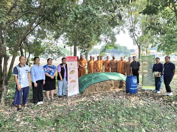วิทยาลัยเสริมทักษะพระภิกษุสามเณร ตำบลบ้านเลน อำเภอบางปะอิน จังหวัดพระนครศรีอยุธยา โดยสาธิตการผลิตน้ำหมักชีวภาพ พด.2 และผลิตปุ๋ยหมักจากฟางข้าวและวัสดุเหลือใช้ทางการเกษตร เศษใบไม้ ลดการเผา