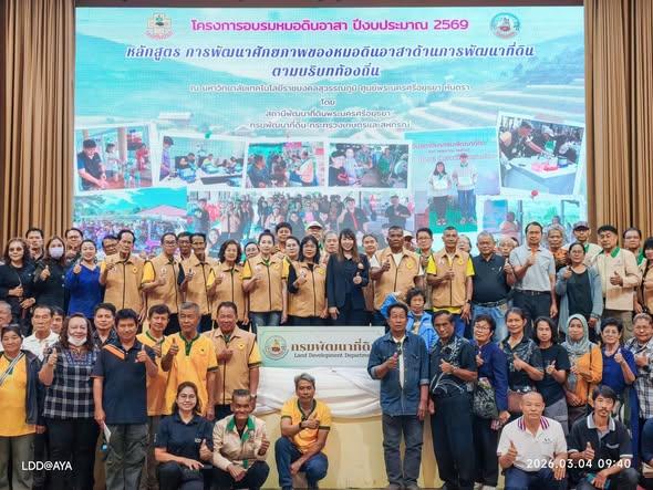 นางสาวกชกร กานตารัมภ์ ผู้อำนวยการสถานีพัฒนาที่ดินพระนครศรีอยุธยา พร้อมด้วยเจ้าหน้าที่สถานีฯ ดำเนินการจัดอบรมหมอดินอาสา หลักสูตร "การพัฒนาศักยภาพของหมอดินอาสาด้านการพัฒนาที่ดินตามบริบทท้องถิ่น ประจำปีงบประมาณ 2569" โดยดำเนินการถ่ายทอดองค์ความรู้และผลิตภัณฑ์ด้านการพัฒนาที่ดิน โดยมี ว่าที่ร้อยตรี เอกรัตน์ จันทร์ศิริ หมอดินอาสาประจำอำเภอลำลูกกา จังหวัดปทุมธานีเป็นวิทยากรบรรยายหัวข้อ การใช้ผลิตภัณฑ์สารเร่ง พด. เพื่อการปรับปรุงบำรุงดินและการไถกลบตอซังฟางข้าว และนางละมุน พรหมบุตร หมอดินอาสาประจำอำเภออุทัย จังหวัดพระนครศรีอยุธยา เป็นวิทยากรบรรยายหัวข้อ การปลูกต้นอ่อนผัก รวมทั้งกิจกรรมเสวนาแลกเปลี่ยนองค์ความรู้เครือข่ายหมอดินอาสา เพื่อเป็นแนวทางให้กับหมอดินอาสาสามารถนำไปต่อยอด และปฏิบัติได้อย่างถูกต้องเหมาะสม การสร้างการเกษตรอย่างยั่งยืนเป็นมิตรต่อสิ่งแวดล้อม และขยายผลสู่เครือข่ายเกษตรกรในชุมชน โดยการอบรมในครั้งนี้จัดขึ้น ณ มหาวิทยาลัยเทคโนโลยีราชมงคลสุวรรณภูมิ ศูนย์หันตรา อำเภอพระนครศรีอยุธยา จังหวัดพระนครศรีอยุธยา
