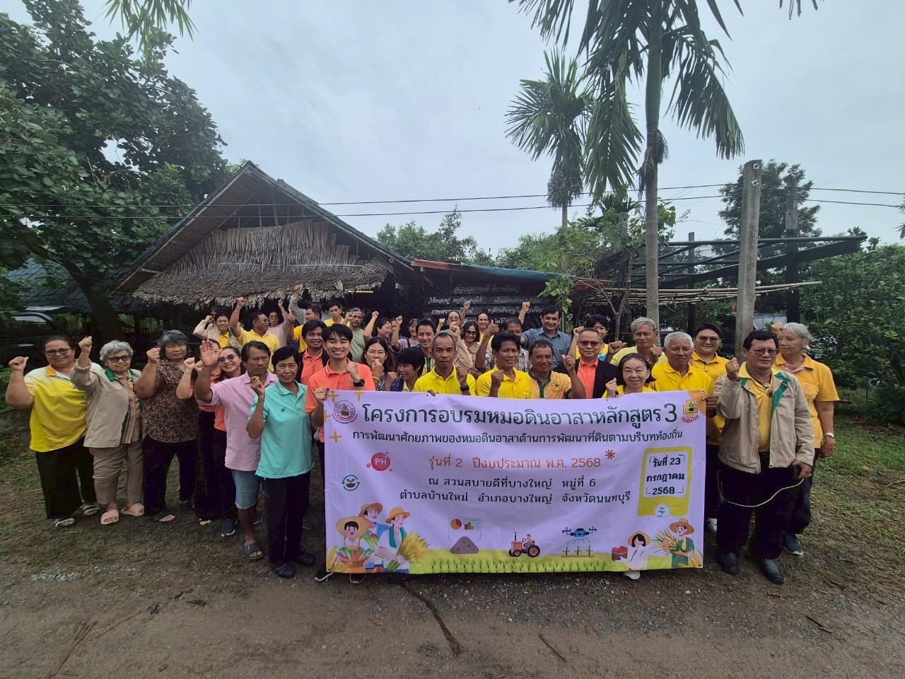 วันพุธที่ 23 กรกฎาคม 2568 นายพินิจ งาเนียม ผู้อำนวยการสถานีพัฒนาที่ดินนนทบุรี เป็นประธานเปิดงานโครงการอบรมหมอดินอาสา (หลักสูตร 3) รุ่นที่ 2 การพัฒนาศักยภาพของหมอดินอาสาด้านการพัฒนาที่ดินตามบริบทท้องถิ่น ปีงบประมาณ 2568 จำนวน 70 ราย (หมอดินอาสาอำเภอบางใหญ่ อำเภอไทรน้อย และอำเภอบางกรวย)