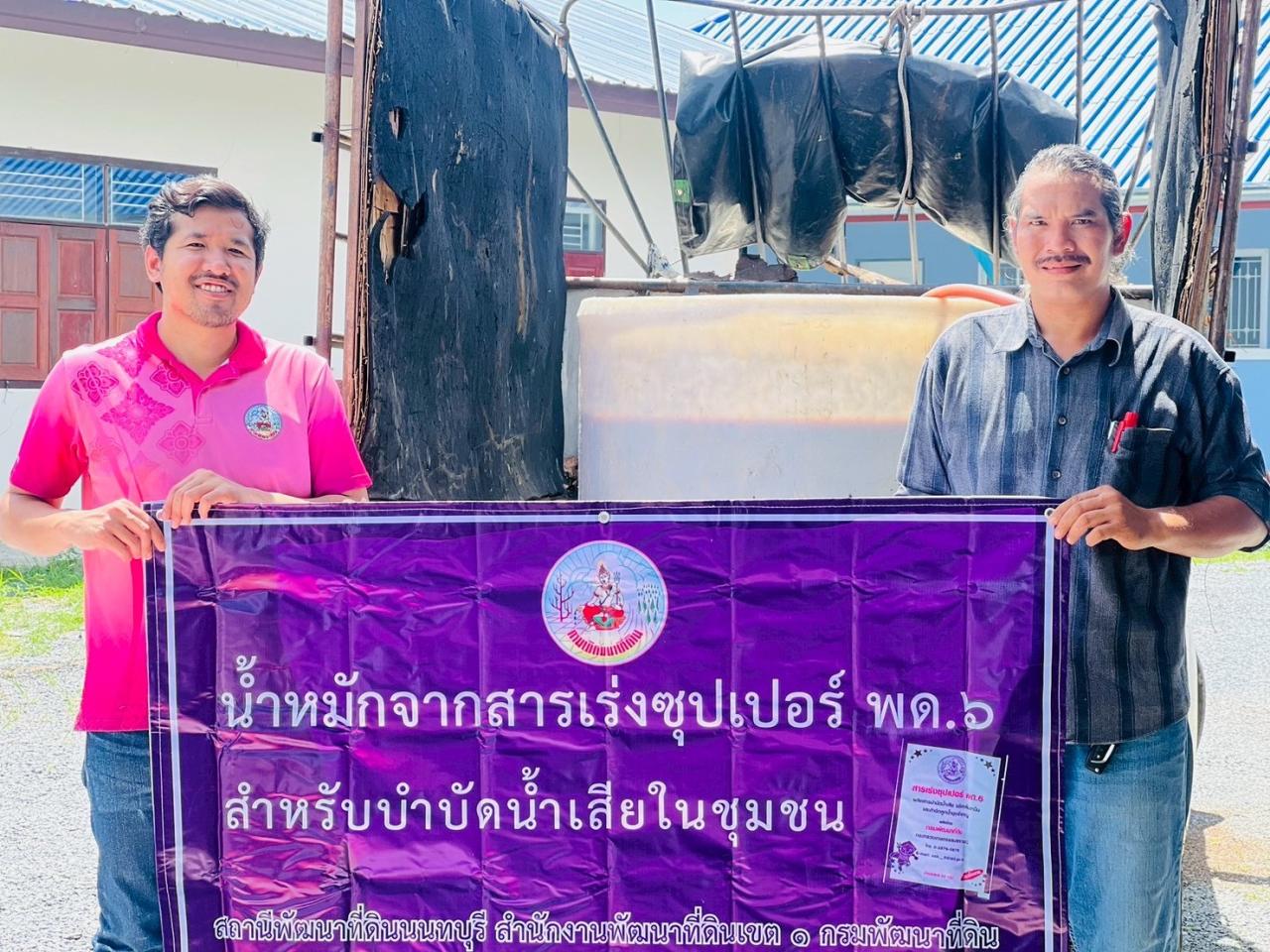 วันอังคารที่ 7 ตุลาคม 2568 นายพินิจ งาเนียม ผู้อำนวยการสถานีพัฒนาที่ดินนนทบุรี มอบหมายเจ้าหน้าที่ฝ่ายวิชาการเพื่อการพัฒนาที่ดิน สนับสนุนน้ำหมักชีวภาพสำหรับบำบัดน้ำเสียจากสารเร่งซุปเปอร์ พด.6 ให้กับประชาชน จำนวน 1,000 ลิตร เพื่อใช้ในการบรรเทาความเดือดร้อนของประชาชนและเกษตรกรที่ได้รับผลกระทบจากปัญหาน้ำเสียในพื้นที่ อำเภอบางบัวทอง จังหวัดนนทบุรี