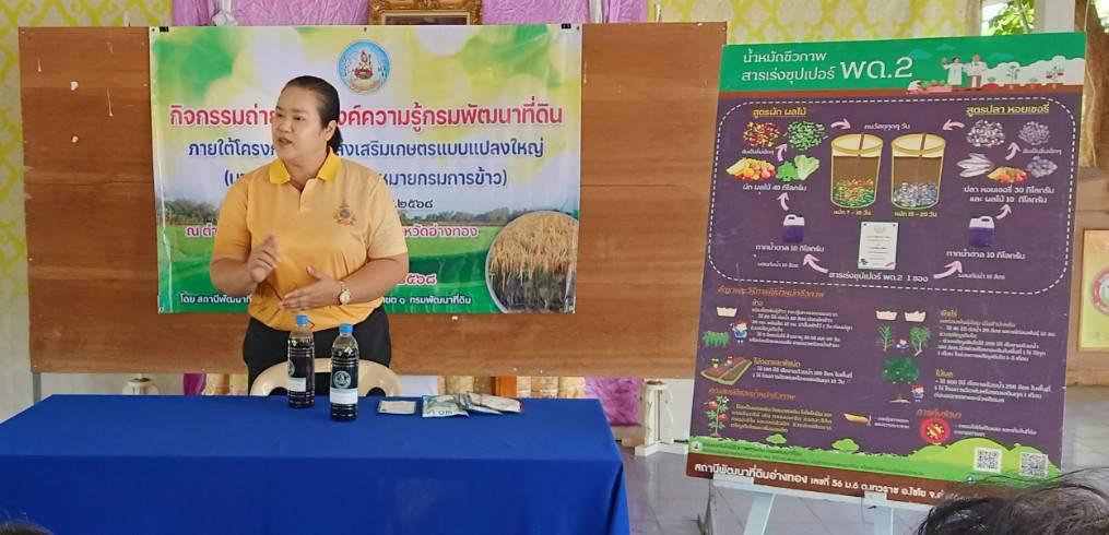 วันจันทร์ที่ 23 มิถุนายน พ.ศ. 2568 นายวัฒนา พัฒนาถวร ผู้อำนวยการสถานีพัฒนาที่ดินอ่างทอง มอบหมายให้ นางสุมาฆมาศ รวยทรัพย์ นักวิชาการเกษตรปฏิบัติการ พร้อมด้วย ว่าที่ร้อยตรีหญิง อุบลรัตน์ เทพรักษ์ นักวิชาการเกษตร จัดกิจกรรมถ่ายทอดองค์ความรู้การพัฒนาที่ดิน เช่น การจัดการดินและปุ๋ย, การปรับปรุงบำรุงดิน พร้อมทั้งสนับสนุนผลิตภัณฑ์เทคโนโลยีชีวภาพกรมพัฒนาที่ดิน ได้แก่ สารเร่งซุปเปอร์ พด. 1,2,3,6,7 และ น้ำหมักชีวภาพจากสารเร่งซุปเปอร์ พด. 2 ให้แก่เกษตรกร ภายใต้โครงการระบบส่งเสริมเกษตรแบบแปลงใหญ่ (นาแปลงใหญ่ พื้นที่เป้าหมายกรมการข้าว) ปีงบประมาณ พ.ศ. 2568 เพื่อให้เกษตรกรมีความรู้ความเข้าใจ และสามารถนำไปปรับใช้กับพื้นที่เกษตรของตนเอง หรือสามารถถ่ายทอดองค์ความรู้ให้กับเกษตรกรรายอื่นได้ ณ อาคารเอนกประสงค์ องค์การบริหารส่วนตำบลหนองแม่ไก่ หมู่ที่ 4 ตำบลหนองแม่ไก่ อำเภอโพธิ์ทอง จังหวัดอ่างทอง โดยมีเกษตรกรเข้ารับการถ่ายทอดองค์ความรู้ จำนวน 15 ราย