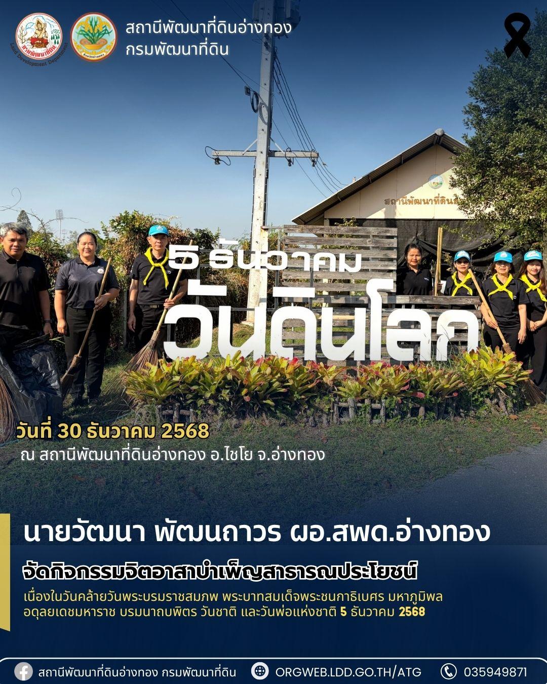 ⏰วันอังคารที่ 30 ธันวาคม 2568 นายวัฒนา พัฒนถาวร ผู้อำนวยการสถานีพัฒนาที่ดินอ่างทอง เจัดกิจกรรมจิตอาสาบำเพ็ญสาธารณประโยชน์ เนื่องในวันคล้ายวันพระบรมราชสมภพ พระบาทสมเด็จพระชนกาธิเบศร มหาภูมิพลอดุลยเดชมหาราช บรมนาถบพิตร วันชาติ และวันพ่อแห่งชาติ 5 ธันวาคม 2568 พร้อมด้วย ข้าราชการ และพนักงานราชการ เพื่อเป็นการน้อมรำลึกในพระมหากรุณาธิคุณและแสดงความจงรักภักดี