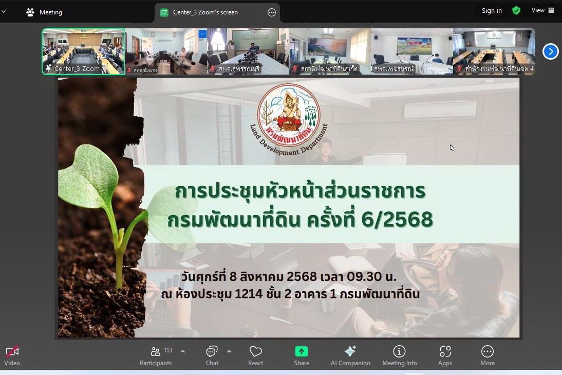 วันที่ 8 สิงหาคม 2568 นางสาวรัตติยา โตจีน ผู้อำนวยการสถานีพัฒนาที่ดินชัยนาท พร้อมด้วยเจ้าหน้าที่ฝ่ายบริหารทั่วไป ร่วมประชุมหัวหน้าส่วนราชการกรมพัฒนาที่ดิน ครั้งที่ 6/2568 โดยมี ดร.ทวีศักดิ์ ธนเดโชพล อธิบดีกรมพัฒนาที่ดิน เป็นประธานในการประชุมฯ ผ่านระบบ ออนไลน์ Zoom Meeting ณ ห้องประชุมสถานีพัฒนาที่ดินชัยนาท อำเภอหนองมะโมง จังหวัดชัยนาท