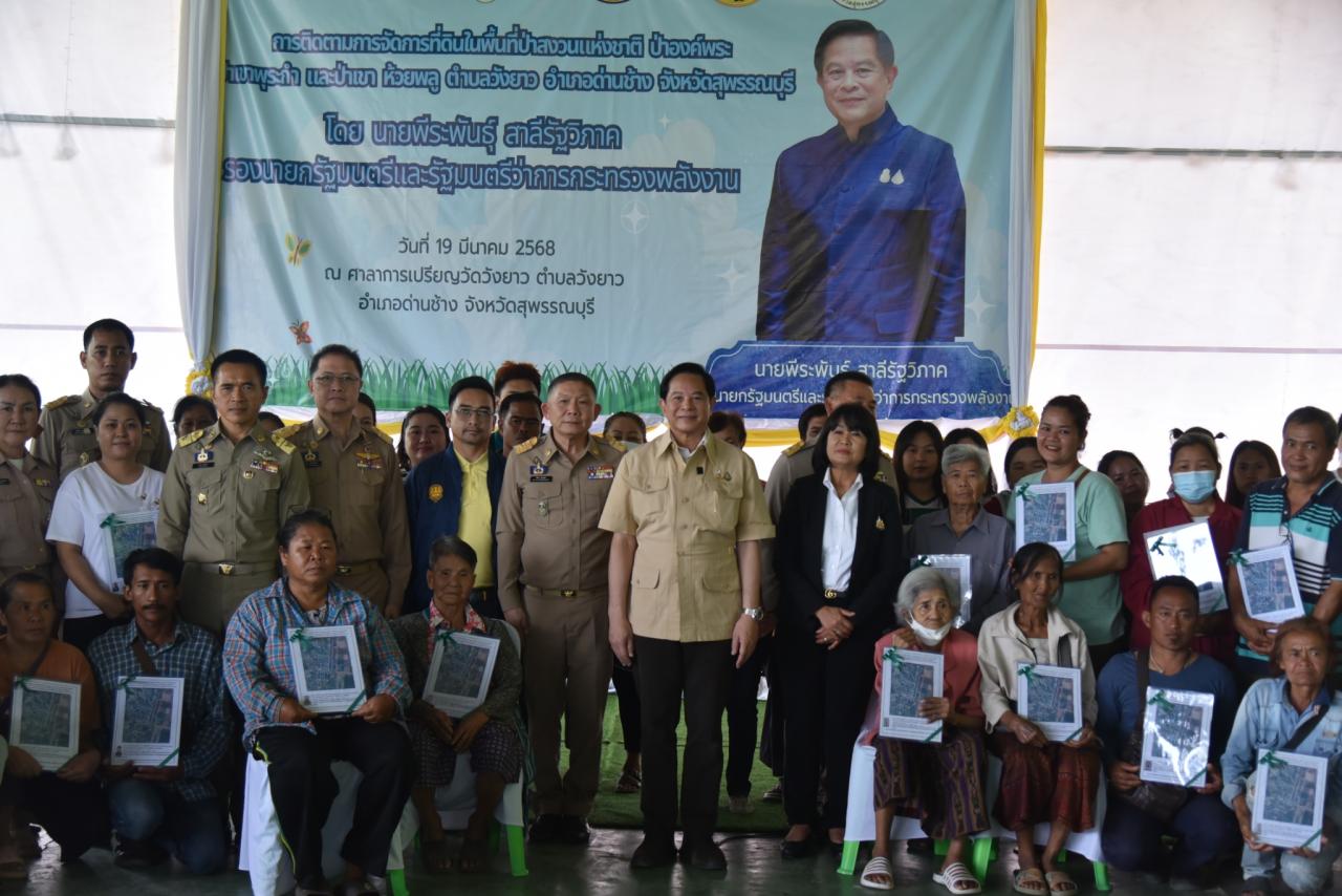 วันพุธที่ 19 มีนาคม 2568 นายองอาจ นักฟ้อน ผู้อำนวยการสถานีพัฒนาที่ดินสุพรรณบุรี ร่วมต้อนรับนายพีระพันธุ์ สาลีรัฐวิภาค รองนายกรัฐมนตรีและรัฐมนตรีว่าการกระทรวงพลังงานที่มาเป็นประธานมอบเอกสารการจัดที่ดินในพื้นที่ป่าสงวนแห่งชาติ ป่าองค์พระ ป่าเขาพุระกำ และป่าเขาห้วยพลู ให้แก่เกษตรกรที่ขอรับการจัดที่ดินในพื้นที่ป่าสงวนแห่งชาติฯ ให้ทำกินในชุมชนตามนโยบายรัฐบาล ของเกษตรกร 65 ราย เนื้อที่รวมกว่า 557 ไร่ ณ ศาลาการเปรียญวัดวังยาว ตำบลวังยาว อำเภอด่านช้าง จังหวัดสุพรรณบุรี