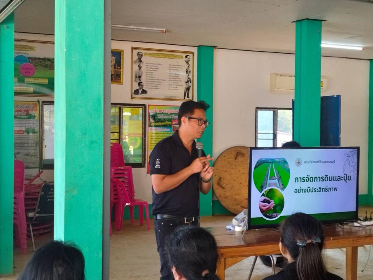 พุธที่ 11 กุมภาพันธ์ 2569 นายองอาจ นักฟ้อน ผู้อำนวยการสถานีพัฒนาที่ดินสุพรรณบุรี มอบหมายนายชัยวัฒน์ วงษ์ไร นักวิชาการเกษตรชำนาญการ รับผิดชอบพื้นที่อำเภอด่านช้าง และนางสาวแพรวา ประสพศรีสุรัตน์ นักวิชาการเกษตร ร่วมบรรยายถ่ายทอดองค์ความรู้ด้านการจัดการดินและปุ๋ยอย่างมีประสิทธิภาพให้เกษตรกรในโครงการระบบส่งเสริมเกษตรแบบแปลงใหญ่