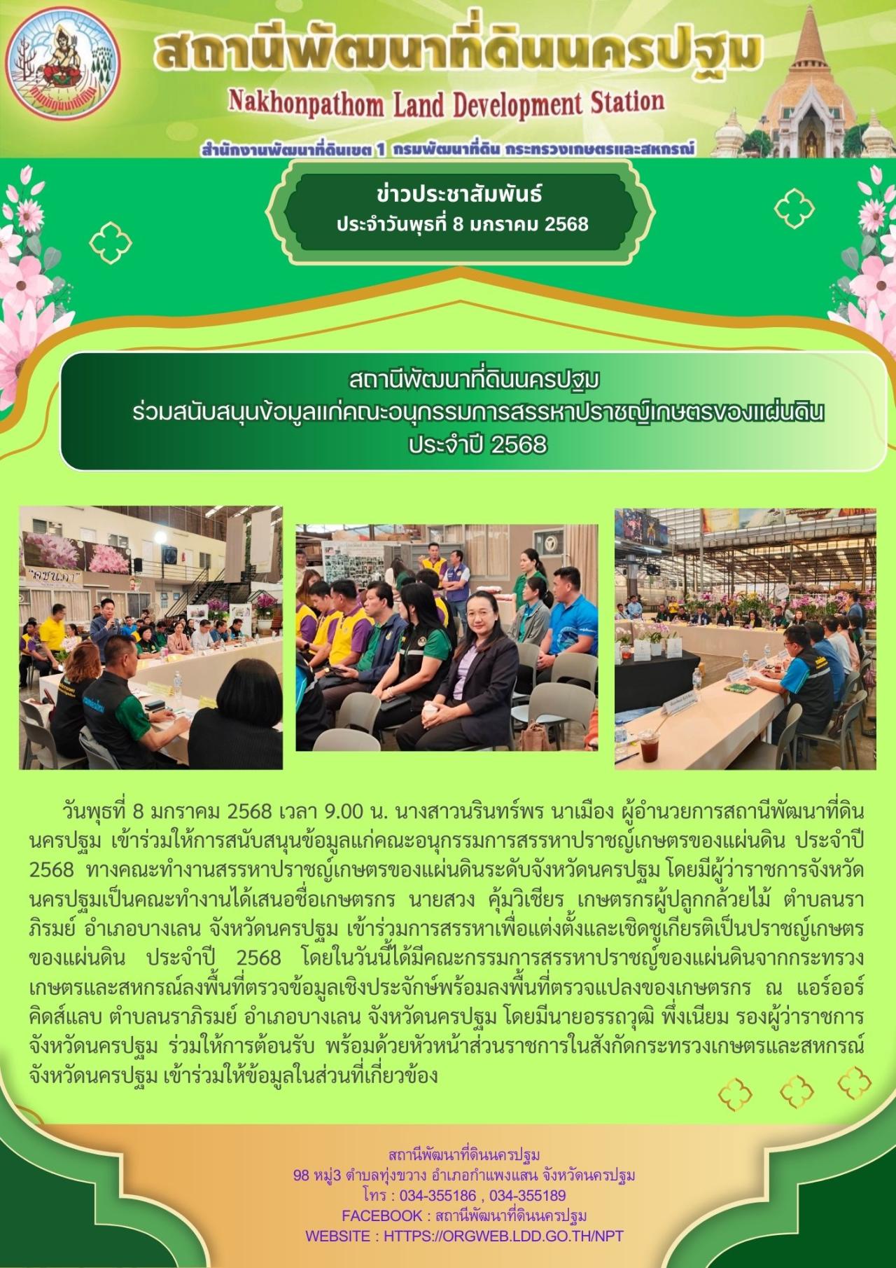วันพุธที่ 8 มกราคม 2568 เวลา 9.00 น. นางสาวนรินทร์พร นาเมือง ผู้อำนวยการสถานีพัฒนาที่ดินนครปฐม เข้าร่วมให้การสนับสนุนข้อมูลแก่คณะอนุกรรมการสรรหาปราชญ์เกษตรของแผ่นดิน ประจำปี 2568 ทางคณะทำงานสรรหาปราชญ์เกษตรของแผ่นดินระดับจังหวัดนครปฐม โดยมีผู้ว่าราชการจังหวัดนครปฐมเป็นคณะทำงานได้เสนอชื่อเกษตรกร นายสวง คุ้มวิเชียร เกษตรกรผู้ปลูกกล้วยไม้ ตำบลนราภิรมย์ อำเภอบางเลน จังหวัดนครปฐม เข้าร่วมการสรรหาเพื่อแต่งตั้งและเชิดชูเกียรติเป็นปราชญ์เกษตรของแผ่นดิน ประจำปี 2568 โดยในวันนี้ได้มีคณะกรรมการสรรหาปราชญ์ของแผ่นดินจากกระทรวงเกษตรและสหกรณ์ลงพื้นที่ตรวจข้อมูลเชิงประจักษ์พร้อมลงพื้นที่ตรวจแปลงของเกษตรกร ณ แอร์ออร์คิดส์แลบ ตำบลนราภิรมย์ อำเภอบางเลน จังหวัดนครปฐม โดยมีนายอรรถวุฒิ พึ่งเนียม รองผู้ว่าราชการจังหวัดนครปฐม ร่วมให้การต้อนรับ พร้อมด้วยหัวหน้าส่วนราชการในสังกัดกระทรวงเกษตรและสหกรณ์ จังหวัดนครปฐม เข้าร่วมให้ข้อมูลในส่วนที่เกี่ยวข้อง