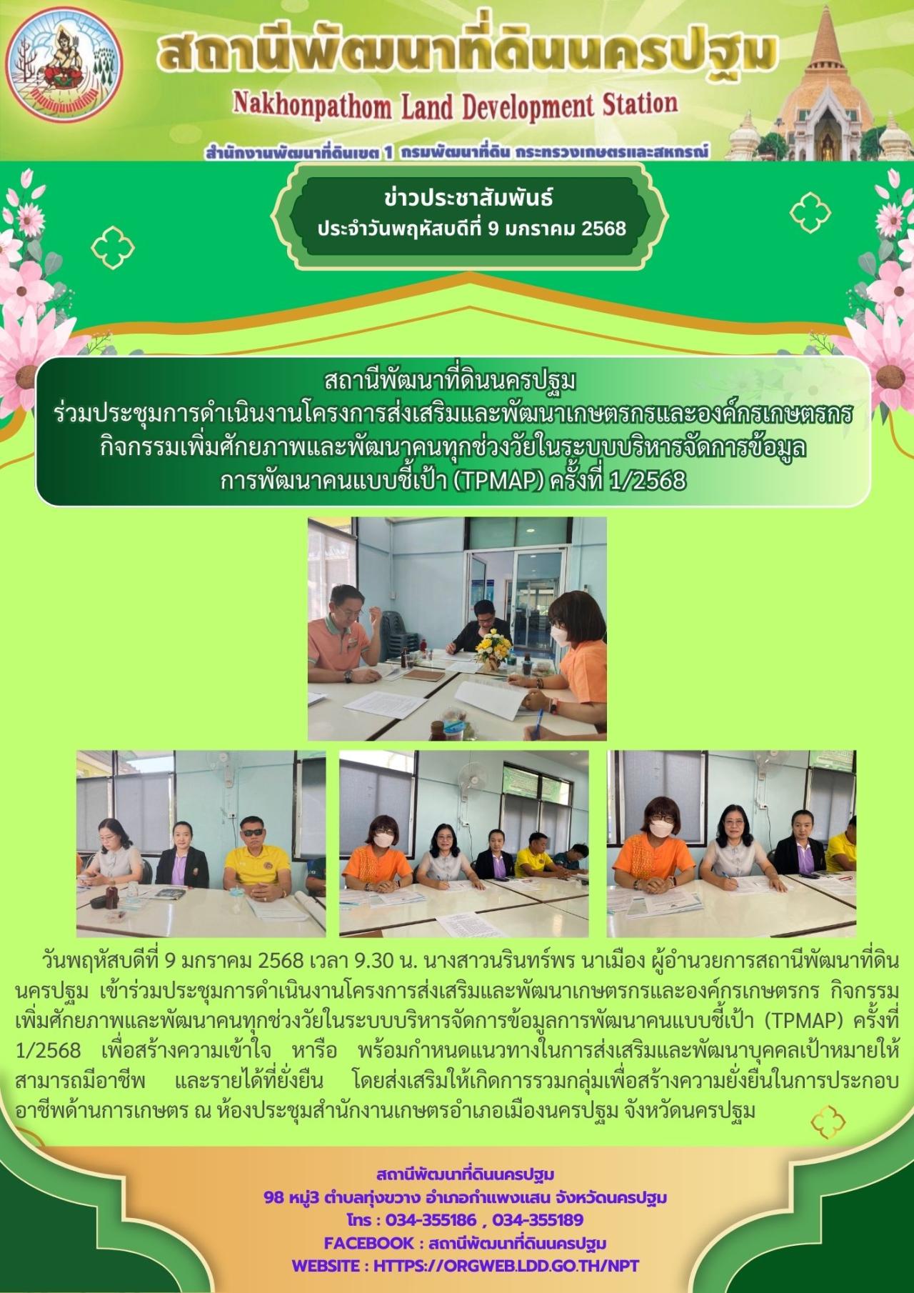 วันพฤหัสบดีที่ 9 มกราคม 2568 เวลา 9.30 น. นางสาวนรินทร์พร นาเมือง ผู้อำนวยการสถานีพัฒนาที่ดินนครปฐม เข้าร่วมประชุมการดำเนินงานโครงการส่งเสริมและพัฒนาเกษตรกรและองค์กรเกษตรกร กิจกรรมเพิ่มศักยภาพและพัฒนาคนทุกช่วงวัยในระบบบริหารจัดการข้อมูลการพัฒนาคนแบบชี้เป้า (TPMAP) ครั้งที่ 1/2568 เพื่อสร้างความเข้าใจ หารือ พร้อมกำหนดแนวทางในการส่งเสริมและพัฒนาบุคคลเป้าหมายให้สามารถมีอาชีพ และรายได้ที่ยั่งยืน โดยส่งเสริมให้เกิดการรวมกลุ่มเพื่อสร้างความยั่งยืนในการประกอบอาชีพด้านการเกษตร ณ ห้องประชุมสำนักงานเกษตรอำเภอเมืองนครปฐม จังหวัดนครปฐม