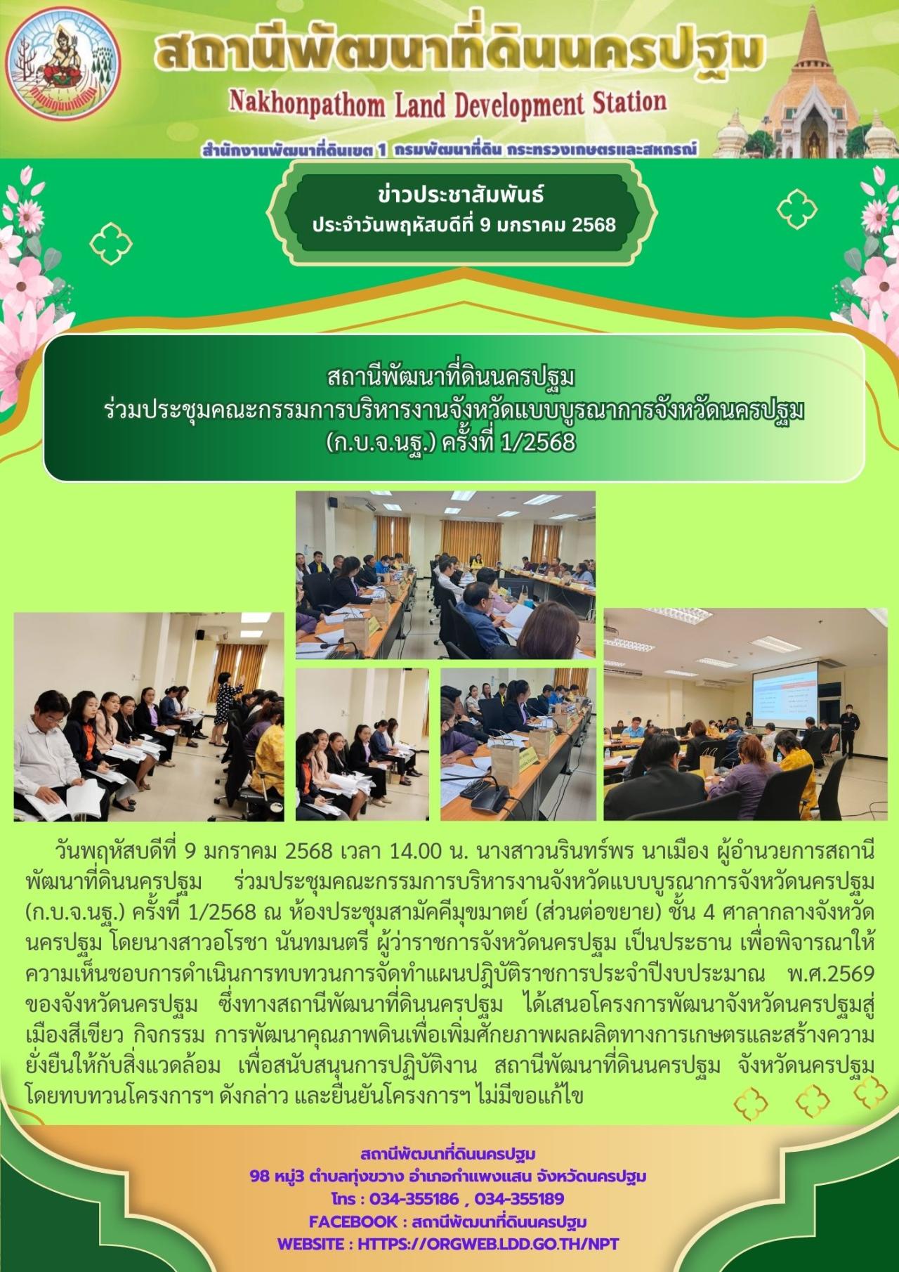 วันพฤหัสบดีที่ 9 มกราคม 2568 เวลา 14.00 น. นางสาวนรินทร์พร นาเมือง ผู้อำนวยการสถานีพัฒนาที่ดินนครปฐม ร่วมประชุมคณะกรรมการบริหารงานจังหวัดแบบบูรณาการจังหวัดนครปฐม (ก.บ.จ.นฐ.) ครั้งที่ 1/2568 ณ ห้องประชุมสามัคคีมุขมาตย์ (ส่วนต่อขยาย) ชั้น 4 ศาลากลางจังหวัดนครปฐม โดยนางสาวอโรชา นันทมนตรี ผู้ว่าราชการจังหวัดนครปฐม เป็นประธาน เพื่อพิจารณาให้ความเห็นชอบการดำเนินการทบทวนการจัดทำแผนปฎิบัติราชการประจำปีงบประมาณ พ.ศ.2569 ของจังหวัดนครปฐม ซึ่งทางสถานีพัฒนาที่ดินนครปฐม ได้เสนอโครงการพัฒนาจังหวัดนครปฐมสู่เมืองสีเขียว กิจกรรม การพัฒนาคุณภาพดินเพื่อเพิ่มศักยภาพผลผลิตทางการเกษตรและสร้างความยั่งยืนให้กับสิ่งแวดล้อม เพื่อสนับสนุนการปฏิบัติงาน สถานีพัฒนาที่ดินนครปฐม จังหวัดนครปฐม โดยทบทวนโครงการฯ ดังกล่าว และยืนยันโครงการฯ ไม่มีขอแก้ไข