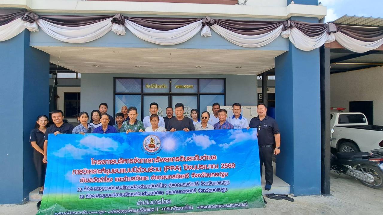วันอังคารที่ 24 มีนาคม 2569 เวลา 09.30 น. นางสาวนรินทร์พร นาเมือง ผู้อำนวยการสถานีพัฒนาที่ดินนครปฐม มอบหมายนายศิรวิทย์ เชิดชู เจ้าพนักงานการเกษตรชำนาญงาน หน่วยวิชาการเพื่อการพัฒนาที่ดินรับผิดชอบอำเภอนครชัยศรี พร้อมนายนัฐพงษ์ แก้วรัตนชัย นักวิชาการเกษตรชำนาญการ และเจ้าหน้าที่ จัดประชุมหารือจัดประชุมหารือประชุมรับฟังความคิดเห็น วิเคราะห์ชุมชนแบบมีส่วนร่วม (Participatory Rural Appraisal : PRA) โครงการบริหารจัดการทรัพยากรดินระดับตำบล ประจำปีงบประมาณ พ.ศ. 2569 เพื่อรับฟังปัญหาพื้นที่ของชุมชนตำบลวัดสำโรง ในด้านดิน ด้านพืช ด้านน้ำ จุดเด่น จุดด้อยของชุมชน เพื่อเป็นแนวทางจัดทำแผนการจัดการทรัพยากรดินระดับตำบลต่อไป โดยมีผู้นำชุมชน หมอดินอาสา เกษตรกร เข้าร่วมพูดคุย หารือแลกเปลี่ยนความคิดเห็น ณ องค์การบริหารส่วนตำบลวัดสำโรง อำเภอนครชัยศรี จังหวัดนครปฐม