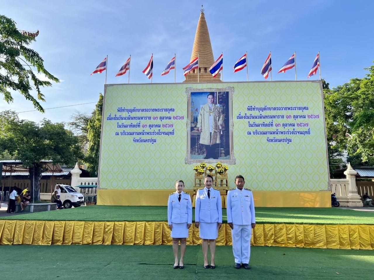 วันอาทิตย์ที่ ๑๓ ตุลาคม ๒๕๖๗ เวลา ๐๗.๓๐ น. นางสาวนรินทร์พร นาเมือง ผู้อำนวยการสถานีพัฒนาที่ดินนครปฐม พร้อมด้วยเจ้าหน้าที่ เข้าร่วมพิธีทำบุญตักบาตรถวายพระราชกุศลและพิธีวางพวงมาลา เนื่องในวันนวมินทรมหาราช ๑๓ ตุลาคม ๒๕๖๗ โดยนางสาวอโรชา นันทมนตรี รองผู้ว่าราชการจังหวัดนครปฐม เป็นประธานในพิธี นายกเหล่ากาชาดจังหวัดนครปฐม ประธานแม่บ้านมหาดไทย หัวหน้าส่วนราชการ หน่วยงานราชการ รัฐวิสาหกิจ และประชาชนทั่วไป เข้าร่วมกิจกรรม เพื่อแสดงความจงรักภักดีและน้อมรำลึกในพระมหากรุณาธิคุณของพระบาทสมเด็จพระบรมชนกาธิเบศร มหาภูมิพลอดุลยเดชมหาราช บรมนาถบพิตร ที่มีต่อปวงชนชาวไทยเป็นล้นพ้นอย่างหาที่สุดมิได้ ณ บริเวณองค์พระปฐมเจดีย์ อำเภอเมืองนครปฐม จังหวัดนครปฐม