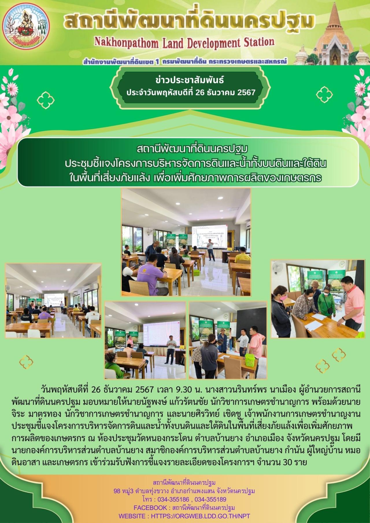 วันพฤหัสบดีที่ 26 ธันวาคม 2567 เวลา 9.30 น. นางสาวนรินทร์พร นาเมือง ผู้อำนวยการสถานีพัฒนาที่ดินนครปฐม มอบหมายให้นายนัฐพงษ์ แก้วรัตนชัย นักวิชาการเกษตรชำนาญการ พร้อมด้วยนายจิระ มาตรทอง นักวิชาการเกษตรชำนาญการ และนายศิรวิทย์ เชิดชู เจ้าพนักงานการเกษตรชำนาญงาน ประชุมชี้แจงโครงการบริหารจัดการดินและน้ำทั้งบนดินและใต้ดินในพื้นที่เสี่ยงภัยแล้งเพื่อเพิ่มศักยภาพการผลิตของเกษตรกร ณ ห้องประชุมวัดหนองกระโดน ตำบลบ้านยาง อำเภอเมือง จังหวัดนครปฐม โดยมีนายกองค์การบริหารส่วนตำบลบ้านยาง สมาชิกองค์การบริหารส่วนตำบลบ้านยาง กำนัน ผู้ใหญ่บ้าน หมอดินอาสา และเกษตรกร เข้าร่วมรับฟังการชี้แจงรายละเอียดของโครงการฯ จำนวน 30 ราย