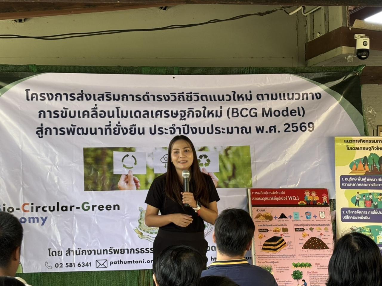 ณ พื้นที่ขับเคลื่อนโมเดลเศรษฐกิจใหม่ (BCG Model) ในพื้นที่จังหวัดปทุมธานี ณ วิสาหกิจชุมชนบึงพัฒนา (ปุ๋ยมูลไส้เดือนสวนลุงเพิ่ม) หมู่ที่ 5ตำบลบึงบา อำเภอหนองเสือ จังหวัดปทุมธานี โดยเครือข่ายอาสาสมัครพิทักษ์ทรัพยากรธรรมชาติและสิ่งแวดล้อมหมู่บ้าน (ทสม.) จังหวัดปทุมธานี บรรยายให้ความรู้เรื่อง "การผลิตปุ๋ยหมักอินทรีย์คุณภาพสูง จากผักตบชวา"และ "การผลิตปุ๋ยหมักอินทรีย์คุณภาพสูง (มูลไส้เดือน) สารปรับปรุงสภาพดิน และฮอร์โมนชีวภาพจากวัสดุเหลือทิ้งในครัวเรือน"