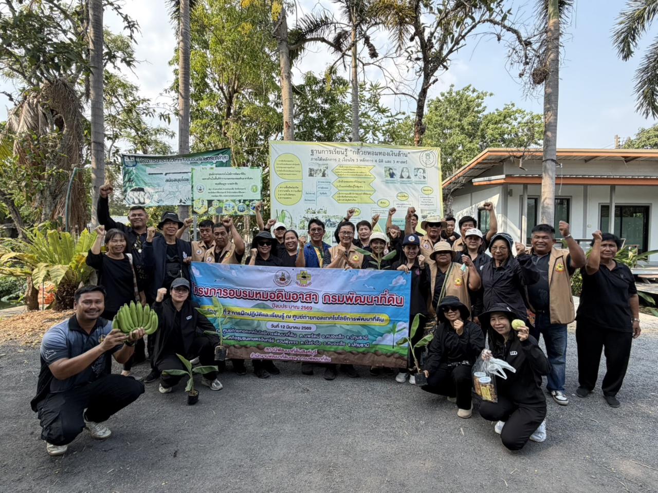 นายรพีพงศ์ หน่วยจันทึก ผู้อำนวยการสถานีพัฒนาที่ดินปทุมธานี มอบหมายให้ นางสาววัลลภา ชัยมาต นักวิชาการเกษตรชำนาญการ พร้อมด้วย นายณัฐพงศ์ วรพจน์ และนายทรงสิทธิ์ ชุมเทพ ต้อนรับคณะศึกษาดูงานหมอดินอาสาจังหวัดสิงห์บุรี พร้อมด้วยนางสาวกัญญาภัทร พอสม ผู้อำนวยการสถานีพัฒนาที่ดินสิงห์บุรีและเจ้าหน้าที่สถานีพัฒนาที่ดินสิงห์บุรี ณ ศูนย์ถ่ายทอดเทคโนโลยีการพัฒนาที่ดินเฉพาะด้านในพื้นที่ทำการเกษตรของหมอดินอาสาดีเด่น หมอดินนุกูล นามปราศัย ตำบลนพรัตน์ โดยมีนายสุชาติ หามนตรีเกษตรตำบลนพรัตน์ ร่วมกล่าวต้อนรับหมอดินอาสา ภายในงานประชุม นายนุกูล นามปราศัย ได้ถ่ายทอดองค์ความรู้ด้านการปลูกกล้วยหอมทอง พร้อมร่วมพูดคุยแลกเปลี่ยนกับคณะหมอดินอาสา อีกทั้งนำคณะฯ ลงพื้นที่เพื่อตรวจเยี่ยมและศึกษาสภาพพื้นที่จริงในพื้นที่ปลูกและพื้นที่สำหรับการแปรรูปผลิตภัณฑ์เพื่อเพิ่มมูลค่าสินค้าเกษตร