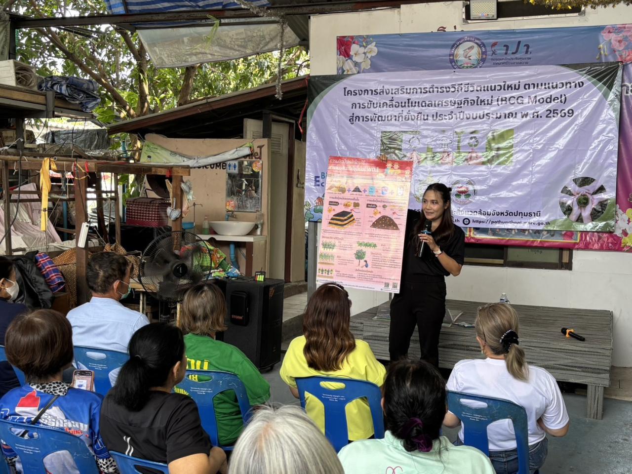 นายรพีพงศ์ หน่วยจันทึก ผู้อำนวยการสถานีพัฒนาที่ดินปทุมธานี มอบหมายให้ นางสาวธัญณัช ปั้นพุ่ม นักวิชาการเกษตรปฏิบัติการ และนายการิณ อินทรวิชัย ร่วมเป็นวิทยากร การจัดอบรมเชิงปฏิบัติการพัฒนาศักยภาพชุมชน/พื้นที่นำร่อง ภายใต้โครงการส่งเสริมการดำรงวิถีชีวิตแนวใหม่ตามแนวทางการขับเคลื่อนโมเดลเศรษฐกิจใหม่ (BCG Model) สู่การพัฒนาที่ยั่งยืน ประจำปีงบประมาณ พ.ศ. 2569 ณ พื้นที่ขับเคลื่อนโมเดลเศรษฐกิจใหม่ (BCG Model) ในพื้นที่จังหวัดปทุมธานี ณ หมู่ที่ 9 ตำบลลาดสวาย อำเภอลำลูกกา จังหวัดปทุมธานี โดยเครือข่ายอาสาสมัครพิทักษ์ทรัพยากรธรรมชาติและสิ่งแวดล้อมหมู่บ้าน (ทสม.) จังหวัดปทุมธานี บรรยายให้ความรู้เรื่อง "การผลิตปุ๋ยหมักอินทรีย์คุณภาพสูง จากผักตบชวา สารปรับปรุงสภาพดิน และฮอร์โมนชีวภาพ จากวัสดุเหลือทิ้งในครัวเรือน"