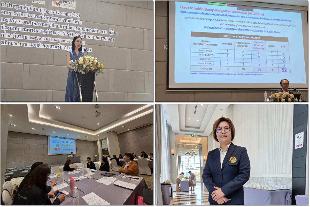 วันอังคารที่ 4 มีนาคม 2568 นางสาวนัทฐา ทักษ์รัตนศรัณย์ ผู้อำนวยการสถานีพัฒนาที่ดินกรุงเทพมหานคร เข้าร่วมประชุมกลุ่มย่อย (Focus Group) (ร่าง) กรอบการรายงานความยั่งยืนที่เหมาะสมสำหรับ MSME และเกณฑ์คัดเลือกธุรกิจ/อุตสาหกรรมที่มีศักยภาพในการดำเนินงานด้านความยั่งยืน ตามแนวคิด ESG ตามประเภทกิจกรรมทางเศรษฐกิจของ MSME ครั้งที่ 1 ภาคการเกษตร จัดโดยสำนักนโยบายและแผนทรัพยากรธรรมชาติและสิ่งแวดล้อม ร่วมกับสถาบันวิจัยและให้คำปรึกษาแห่งมหาวิทยาลัยธรรมศาสตร์ ดำเนินโครงการยกระดับการดำเนินงานเพื่อขับเคลื่อนการผลิตและการบริโภคที่ยั่งยืน เพื่อศึกษาและจัดทำกรอบการรายงานความยั่งยืนที่เหมาะสม สำหรับวิสาหกิจขนาดกลาง วิสาหกิจขนาดย่อม และวิสาหกิจขนาดย่อย (MSME) และยกระดับการดำเนินงานตามเป้าหมายการพัฒนาที่ยั่งยืนที่ 12 สร้างหลักประกันให้มีรูปแบบการผลิตและการบริโภคที่ยั่งยืน (SDG 12) รวมทั้งสร้างการบูรณาการการดำเนินงานร่วมกันระหว่างหน่วยงานที่เกี่ยวข้อง ณ ห้องลาเวนเดอร์ 1 ชั้น 2 อาคารทีเค 3 โรงแรม ทีเค.พาเลซ แอนด์ คอนเวนชั่น กรุงเทพมหานคร