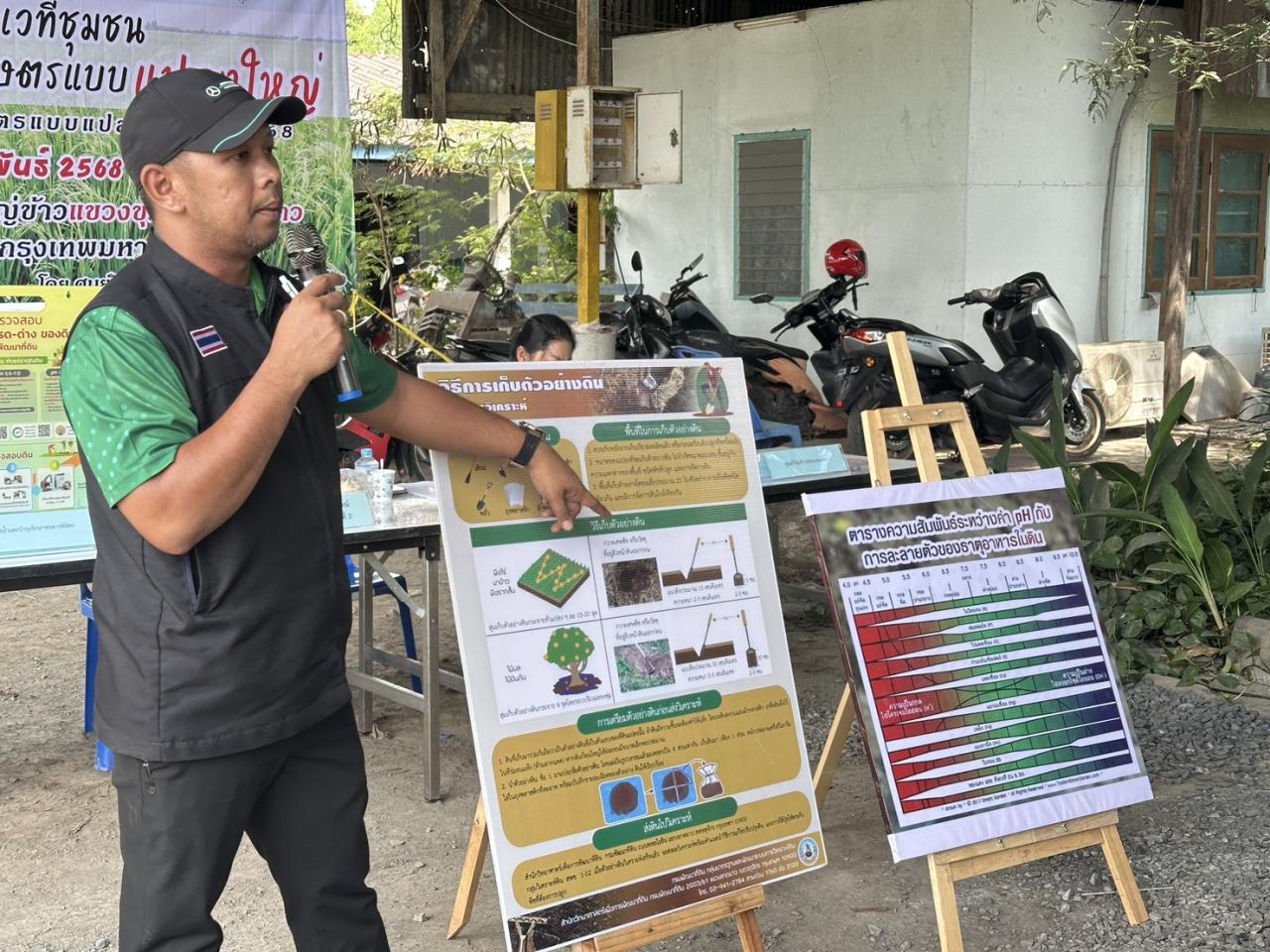 วันศุกร์ที่ 7 มีนาคม 2568 นางสาวนัทฐา ทักษ์รัตนศรัณย์ ผู้อำนวยการสถานีพัฒนาที่ดินกรุงเทพมหานคร มอบหมายให้ นายกฤษฎา จงดี เจ้าพนักงานการเกษตรปฏิบัติงาน และนางสาวอริศชา สิงหมงคล นักวิชาการเกษตร เข้าร่วมจัดอบรมให้ความรู้และถ่ายทอดเทคโนโลยี "การจัดการตอซังฟางด้วยน้ำหมักชีวภาพจาก สารเร่งซุปเปอร์ พด.2“ พร้อมทั้งสาธิตการตรวจวิเคราะห์ดินเบื้องต้นด้วยชุดตรวจค่าความเป็นกรด-ด่างในดิน Ldd Test Kit (pH) เพื่อตรวจวิเคราะห์ดินก่อนฤดูกาลเพาะปลูกและหลังฤดูการเก็บเกี่ยว อีกทั้งยังเสริมสร้างความเข้าใจให้เกษตรกรตระหนักถึงผลกระทบของการเผาตอซัง และเป็นทางเลือกในการใช้เทคโนโลยีทดแทนการเผา ณ ที่ทำการกลุ่มนาแปลงใหญ่แขวงขุมทอง เขตลาดกระบัง กรุงเทพมหานคร