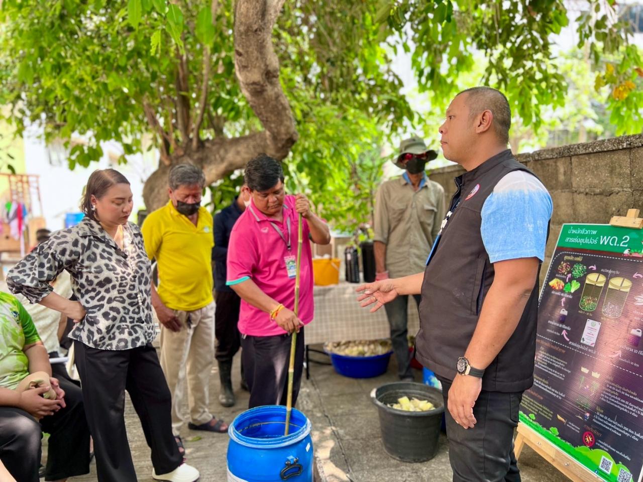 วันอังคารที่ 18 มีนาคม 2568 นางสาวนัทฐา ทักษ์รัตนศรัณย์ ผู้อำนวยการสถานีพัฒนาที่ดินกรุงเทพมหานคร มอบหมายให้นายกฤษฎา จงดี เจ้าพนักงานการเกษตรปฏิบัติงาน เข้าร่วมเป็นวิทยากรอบรมการทำปุ๋ยหมักจากเศษอาหาร ในโครงการสำนักงานสีเขียวกรุงเทพมหานคร (Bangkok Green Office) เพื่อขับเคลื่อนสำนักงานต่าง ๆ เปลี่ยนผ่านสู่สำนักงานสีเขียว ผ่านแนวทางปฏิบัติที่เป็นมิตรต่อสิ่งแวดล้อม เน้นการใช้ทรัพยากรอย่างคุ้มค่า ส่งเสริมการลดมลพิษ และสร้างสุขอนามัยที่ดีแก่บุคลากร ซึ่งสถานีพัฒนาที่ดินกรุงเทพมหานครร่วมถ่ายทอดองค์ความรู้การทำปุ๋ยหมักจากเศษอาหาร โดยใช้สารเร่งซุปเปอร์ พด.6 ที่ผลิตโดยกรมพัฒนาที่ดิน สารเร่ง พด.6 เป็นเชื้อจุลินทรีย์ที่มีคุณสมบัติในการเพิ่มประสิทธิภาพการหมักเศษอาหารในสภาพที่ไม่มีออกซิเจน เพื่อผลิตสารสำหรับทำความสะอาดคอกสัตว์ บำบัดน้ำเสีย และลดกลิ่นเหม็นตามท่อระบายน้ำ โดยผู้เข้าอบรมให้ความสนใจในเทคโนโลยีชีวภาพของกรมพัฒนาที่ดินเป็นอย่างมาก ณ สำนักพัฒนาสังคม แขวงดินแดง เขตดินแดง กรุงเทพมหานคร