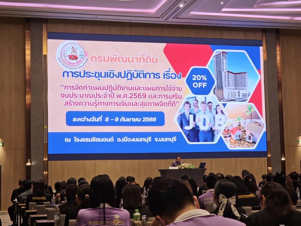 วันที่ 8-9 กันยายน 2568 นางสาวนัทฐา ทักษ์รัตนศรัณย์ ผู้อำนวยการสถานีพัฒนาที่ดินกรุงเทพมหานคร พร้อมด้วย นางสาวจุฑารัตน์ วิจิตรปัญญา เจ้าพนักงานธุรการปฏิบัติงาน และนางสาวธัญญรัตน์ ภัทรโท เจ้าหน้าที่วิเคราะห์นโยบายและแผน เข้าร่วมประชุมเชิงปฏิบัติการ เรื่อง “การจัดทำแผนปฏิบัติงานและแผนการใช้จ่ายงบประมาณประจำปี พ.ศ. 2569 และการเสริมสร้างความรู้ทางการเงินและสุขภาพจิตที่ดี” ณ โรงแรมริชมอนด์ อำเภอเมือง จังหวัดนนทบุรี โดยมีวัตถุประสงค์ เพื่อให้บุคลากรมีความเข้าใจนโยบายและภาพรวม แนวทางการดำเนินงานของกรมฯ แผนงานและงบประมาณปี 2569 และทราบถึงรายละเอียดการจัดสรรงบประมาณ เพื่อวางแผนการดำเนินงานและแผนการใช้จ่ายเงิน อีกทั้งสร้างความเข้าใจในการเตรียมความพร้อมด้านความมั่นคงทางการเงินและการมีสุขภาพจิตที่ดี ที่เป็นปัจจัยสำคัญของบุคลากรในการขับเคลื่อนผลงานให้บรรลุเป้าหมายขององค์กร