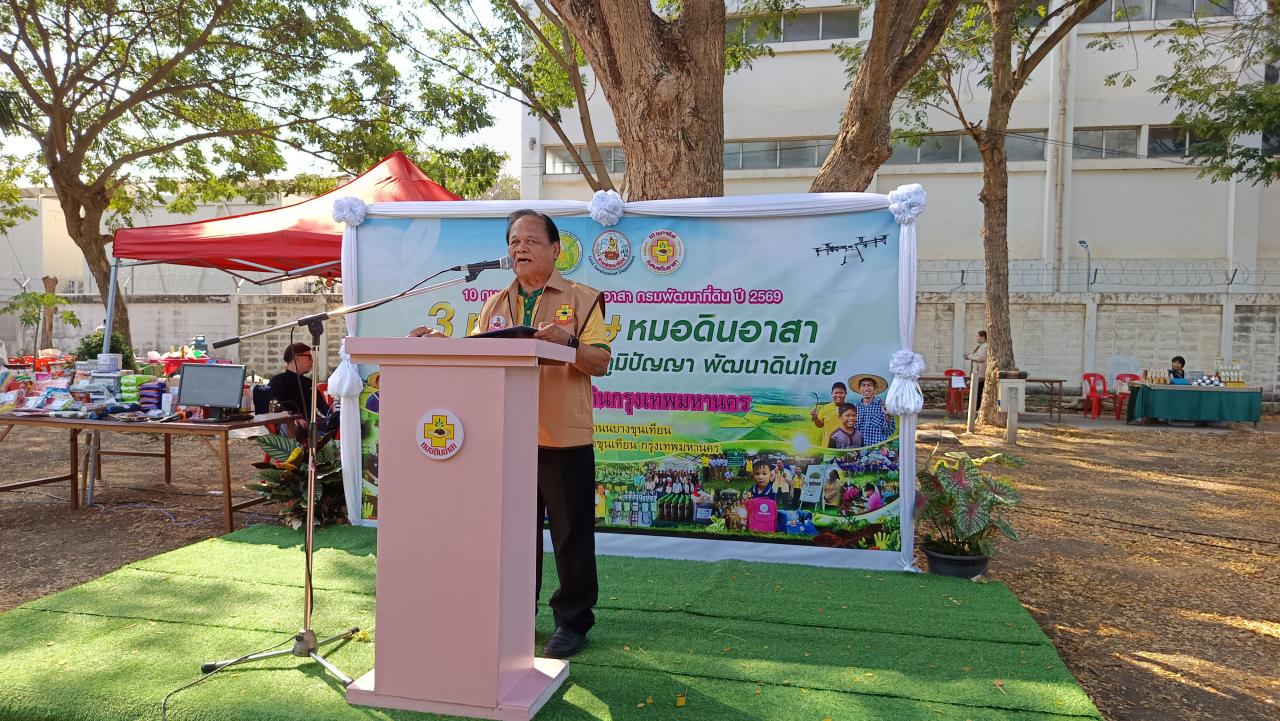 วันอังคารที่ 10 กุมภาพันธ์ 2569 สถานีพัฒนาที่ดินกรุงเทพมหานคร จัดกิจกรรมงานวันหมอดินอาสา ประจำปี 2569 ภายใต้แนวคิด “3 ทศวรรษ หมอดินอาสา สืบสานคุณค่า ต่อยอดภูมิปัญญา พัฒนาดินไทย” เพื่อเชิดชูเกียรติและแสดงความขอบคุณต่อหมอดินอาสา เครือข่ายภาคประชาชนที่มีบทบาทสำคัญในการอนุรักษ์และพัฒนาทรัพยากรดินของประเทศมาอย่างต่อเนื่องกว่า 30 ปี โดยมีนางสาวนัทฐา ทักษ์รัตนศรัณย์ ผู้อำนวยการสถานีพัฒนาที่ดินกรุงเทพมหานคร กล่าวต้อนรับคณะหมอดินอาสากรุงเทพมหานคร และนายวิวัฒน์ นุ่มกำเนิด หมอดินอาสาประจำจังหวัดกรุงเทพมหานคร เป็นประธานเปิดงาน มีหมอดินอาสา ผู้แทนจากสำนักงานพัฒนาที่ดินเขต 1 เจ้าหน้าที่สำนักงานเขตภาษีเจริญ และเจ้าหน้าที่ เข้าร่วมงานประมาณ 100 ราย ณ สถานีพัฒนาที่ดินกรุงเทพมหานคร แขวงท่าข้าม เขตบางขุนเทียน กรุงเทพมหานคร