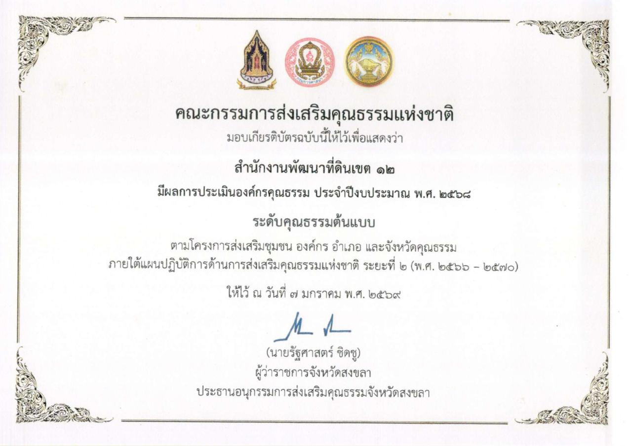 กลุ่มตรวจสอบภายใน ร่วมแสดงความยินดีกับ สำนักงานพัฒนาที่ดินเขต 12 ที่ได้รับผลการประเมินองค์กรคุณธรรม ประจำปีงบประมาณ พ.ศ. 2568 จาก คณะกรรมการส่งเสริมคุณธรรมแห่งชาติ ระดับคุณธรรมต้นแบบ ตามโครงการส่งเสริมชุมชน องค์กร อำเภอ และจังหวัดคุณธรรม ภายใต้แผนปฏิบัติการด้านการส่งเสริมคุณธรรมแห่งชาติ ระยะที่ 2 (พ.ศ. 2566-2570)