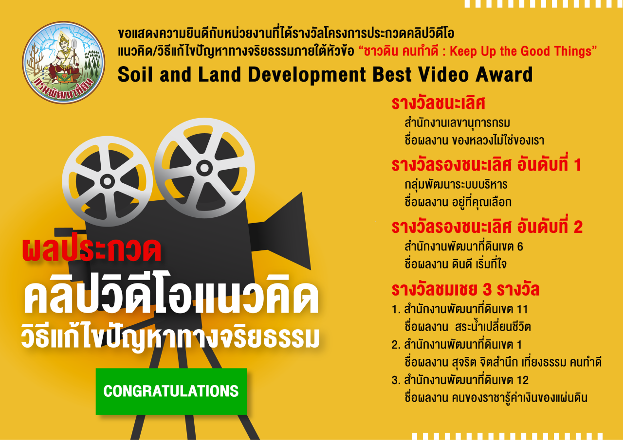 กพร. ได้รับรางวัลรองชนะเลิศอันดับ 1 จากโครงการประกวดคลิปวิดีโอแนวคิด/วิธีแก้ไขปัญหาทางจริยธรรม ภายใต้หัวข้อ “ชาวดิน คนทำดี : Keep Up the Good Things” โดยผลงานได้สะท้อนแนวคิดสร้างสรรค์และเจตนารมณ์ในการส่งเสริมคุณธรรมอย่างชัดเจนพร้อมกันนี้ ขอแสดงความยินดีกับหน่วยงานอื่นที่ได้รับรางวัล ซึ่งต่างนำเสนอผลงานที่โดดเด่น และช่วยเสริมสร้างวัฒนธรรมสุจริตได้อย่างน่าชื่นชม