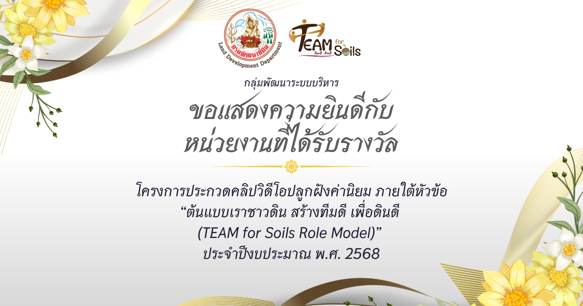 วันที่ 23 พฤษภาคม 2568 กลุ่มพัฒนาระบบบริหาร ขอแสดงความยินดีกับหน่วยงานที่ได้รับรางวัลจากโครงการประกวดคลิปวิดีโอปลูกฝังค่านิยมภายใต้หัวข้อ“ต้นแบบเราชาวดิน สร้างทีมดี เพื่อดินดี (TEAM for Soils RoleModel)” ประจำปีงบประมาณ พ.ศ. 2568 เพื่อให้บุคลากรกรมพัฒนาที่ดินมีความเข้าใจเกี่ยวกับค่านิยม "TEAM for Soils ทีมดี ดินดี" และสามารถนำไปประยุกต์ใช้ในการทำงานได้อย่างสม่ำเสมอและให้บุคลากรทุกคนมีทิศทางและความมุ่งมั่นในการทำงานให้สอดคล้องกับวิสัยทัศน์ของกรมพัฒนาที่ดินในอนาคตและช่วยให้การดำเนินงานตามเป้าหมายสำเร็จได้อย่างมีประสิทธิภาพและเพื่อใช้ในการสื่อสารและประชาสัมพันธ์ของกรมพัฒนาที่ดินต่อไปจึงประกาศหน่วยงานผู้ได้คัดเลือกรับโล่รางวัลเชิดชูเกียรติ จำนวน 5 หน่วยงาน ดังนี้