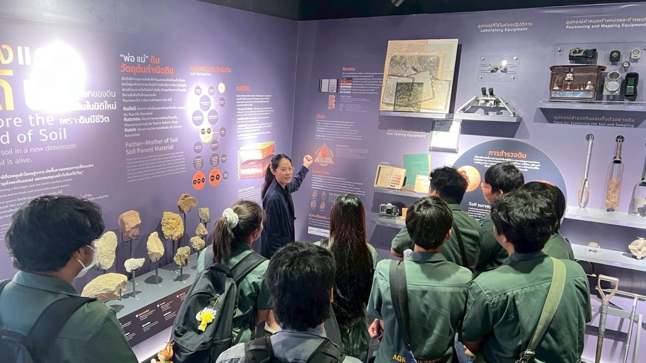 เจ้าหน้าที่กลุ่มสำรวจและจำแนกดิน กองสำรวจดินและวิจัยทรัพยากรดิน ร่วมต้อนรับคณะนักศึกษาและอาจารย์จากคณะนวัตกรรมเกษตร วิทยาลัยนวัตกรรมเกษตรและเทคโนโลยีอาหาร มหาวิทยาลัยรังสิต และนำเยี่ยมชมพิพิธภัณฑ์ดิน โดยบรรยยายให้ความรู้ในส่วนของนิทรรศการ การกำเนิดดิน ความสำคัญของดิน การตรวจสอบสัณฐานวิทยาของดิน ทรัพยากรดินและการใช้ประโยชน์ที่ดินของประเทศไทย และดินที่มีข้อจำกัดทางการเกษตร เป็นการสร้างความตระหนักรู้ ซึ่งนำไปสู่การนำข้อมูลดินไปประยุกต์ใช้ประโยชน์อย่างถูกต้องเหมาะสมต่อไป