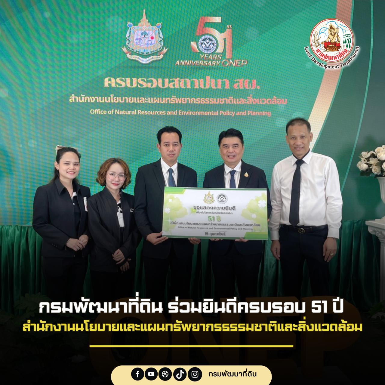 นายจตุรงค์ สิทธิวรกร ผู้อำนวยการกลุ่มงานเลขานุการคณะกรรมการพัฒนาที่ดิน สำนักงานเลขานุการกรม ได้รับมอบหมายจากกรมพัฒนาที่ดิน เข้าร่วมแสดงความยินดีเนื่องในโอกาสวันคล้ายวันสถาปนา ครบรอบ 51 ปี สำนักงานนโยบายและแผนทรัพยากรธรรมชาติและสิ่งแวดล้อม (สผ.) ณ อาคารทิปโก้ 2 ถนนพระรามที่ 6 แขวงพญาไท เขตพญาไท กรุงเทพฯ ในโอกาสนี้ กรมพัฒนาที่ดิน ได้ร่วมสมทบบริจาคเงินเข้ากองทุนสวัสดิการ สผ. เพื่อนำรายได้บางส่วนไปบริจาคให้กับองค์กรสาธารณกุศล มูลนิธิต่าง ๆ รวมถึงจัดสวัสดิการให้กับบุคลากร โดยมีนายจิรวัฒน์ ระติสุนทร รองเลขาธิการสำนักงานนโยบายและแผนทรัพยากรธรรมชาติและสิ่งแวดล้อม และเจ้าหน้าที่ ให้การต้อนรับ