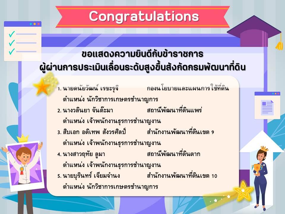 ขอแสดงความยินดีกับข้าราชการผู้ผ่านการประเมินเลื่อนระดับให้สูงขึ้น ตำแหน่งประเภทวิชาการจำนวน 2 ท่าน และตำแหน่งประเภททั่วไป 3 ท่าน