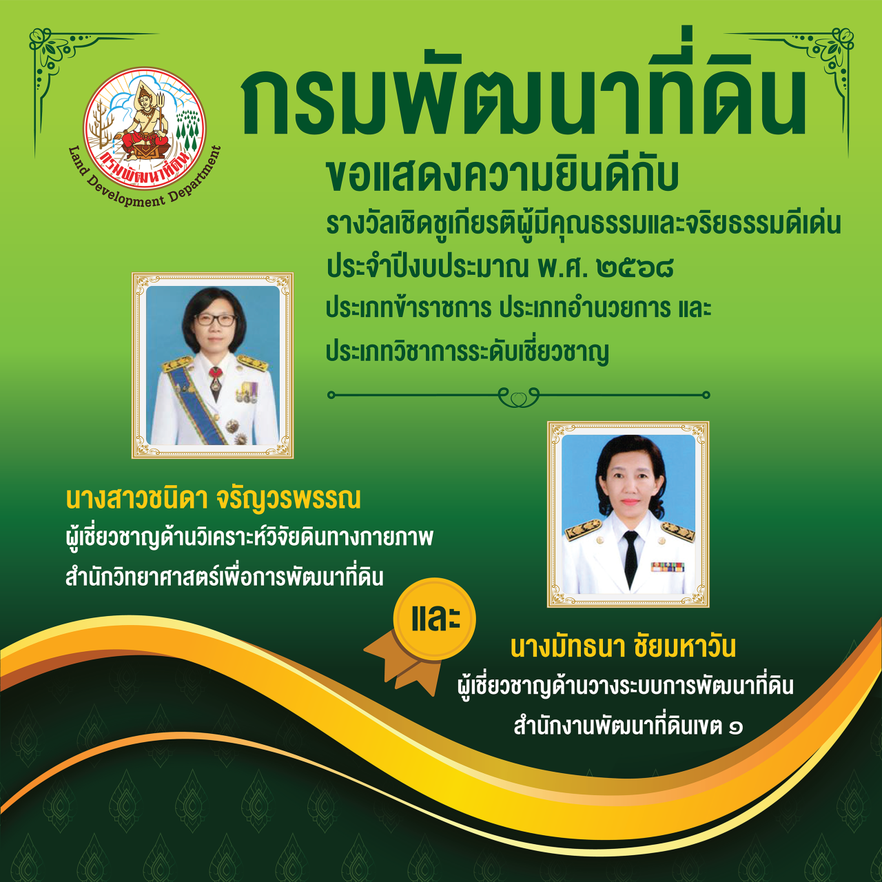 โดยจะมีพิธีมอบโล่รางวัลเชิดชูเกียรติให้กับบุคลากรที่ได้รับคัดเลือกในวันที่ 23 พฤษภาคม 2568 ณ กรมพัฒนาที่ดิน