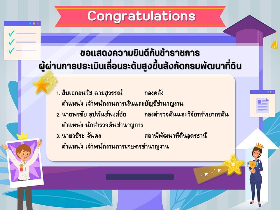 ขอแสดงความยินดีกับข้าราชการผู้ผ่านการประเมินเลื่อนระดับให้สูงขึ้น ตำแหน่งประเภทวิชาการจำนวน 1 ท่าน และตำแหน่งประเภททั่วไปจำนวน 2 ท่าน