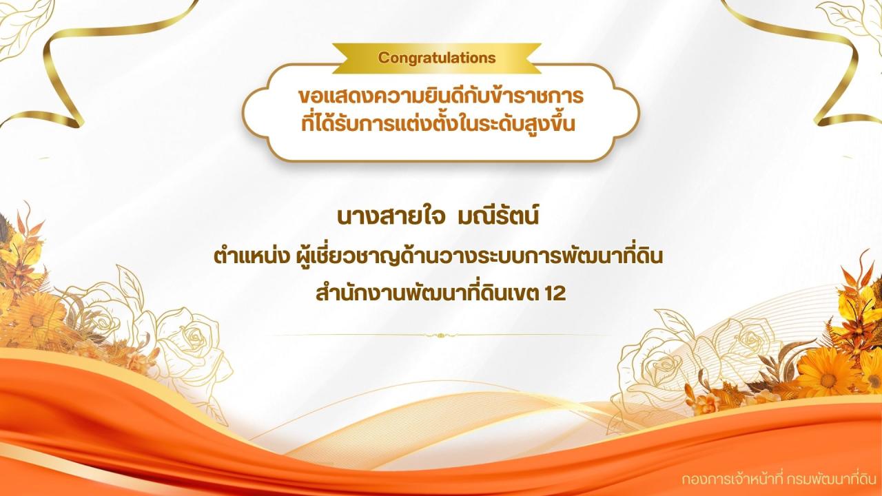 นางสายใจ มณีรัตน์ ตำแหน่ง ผู้เชี่ยวชาญด้านวางระบบการพัฒนาที่ดิน สำนักงานพัฒนาที่ดินเขต 12