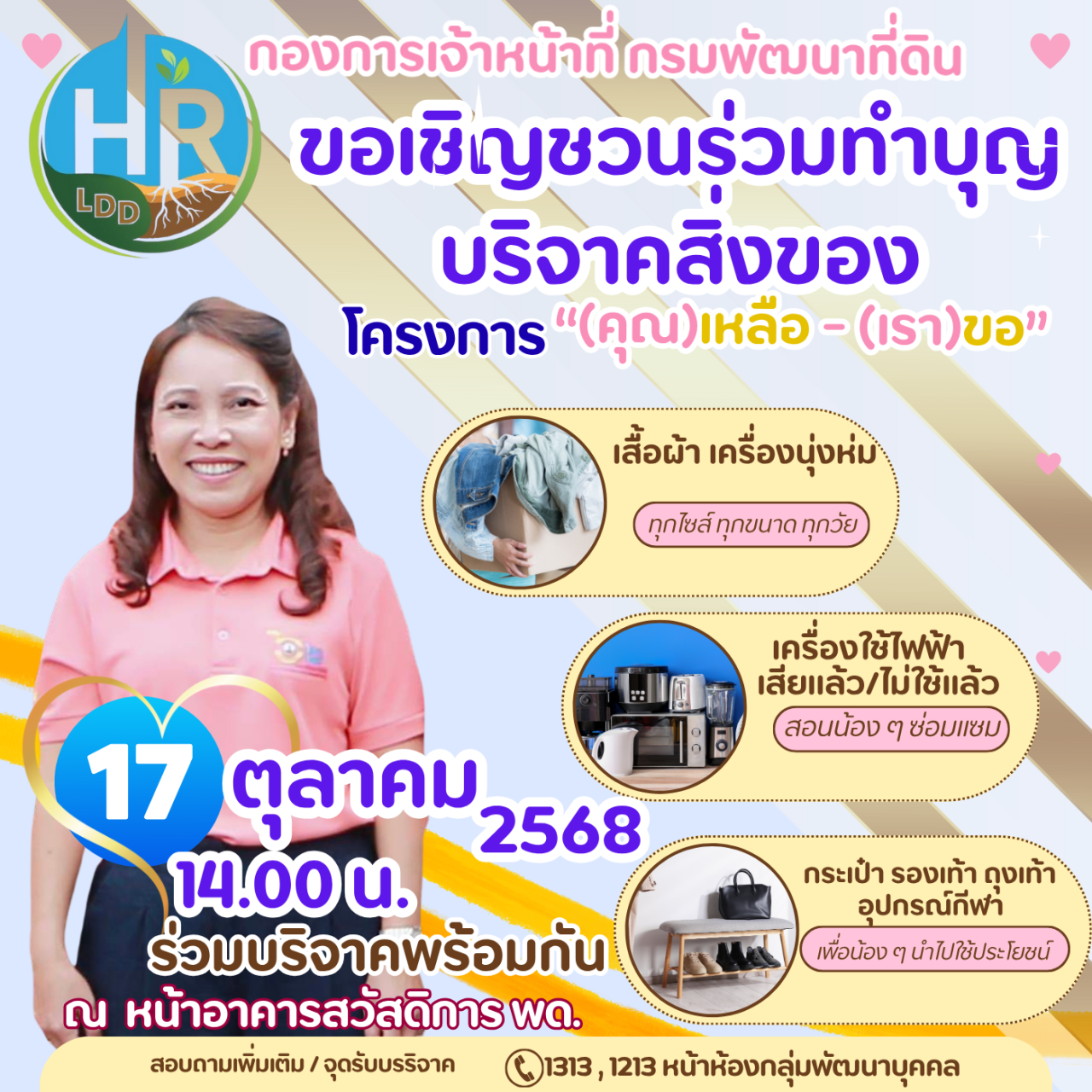 โดยทางกองการเจ้าหน้าที่จะรวบรวมสิ่งของในวันที่ 16 ตุลาคม 2568 และขอเชิญทุกท่านมาร่วมส่งมอบสิ่งของให้แก่เจ้าหน้าที่โครงการเหลือ-ขอ ในวันที่ 17 ตุลาคม 2568 เวลา 14.00 น. ณ หน้าอาคารสวัสดิการ กรมพัฒนาที่ดิน