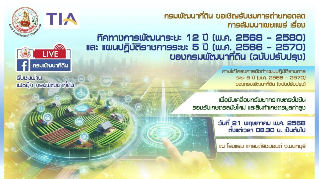 ขอเชิญติดตามรับชมการถ่ายทอดสดการสัมมนาเผยแพร่ เรื่อง ทิศทางการพัฒนา ระยะ 12 ปี (พ.ศ. 2568 - 2580) และแผนปฏิบัติราชการ ระยะ 5 ปี (พ.ศ. 2566 - 2570) กรมพัฒนาที่ดิน (ฉบับปรับปรุง) ภายใต้โครงการจัดทำแผนปฏิบัติราชการ ระยะ 5 ปี (พ.ศ. 2566 - 2570) กรมพัฒนาที่ดิน (ฉบับปรับปรุง) เพื่อขับเคลื่อนทรัพยากรเกษตรยั่งยืนรองรับเกษตรสมัยใหม่ และสินค้าเกษตรมูลค่าสูง วันที่ 21 พฤษภาคม 2568 เวลา 8.30 น. เป็นต้นไป ณ โรงแรม แกรนด์ริชมอนด์ จ.นนทบุรี รับชมผ่านทางเพจเฟชบุ๊ก : กรมพัฒนาที่ดิน